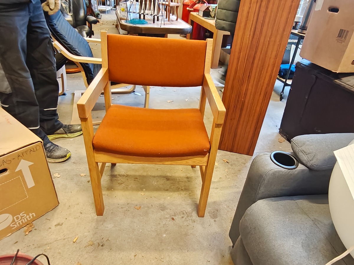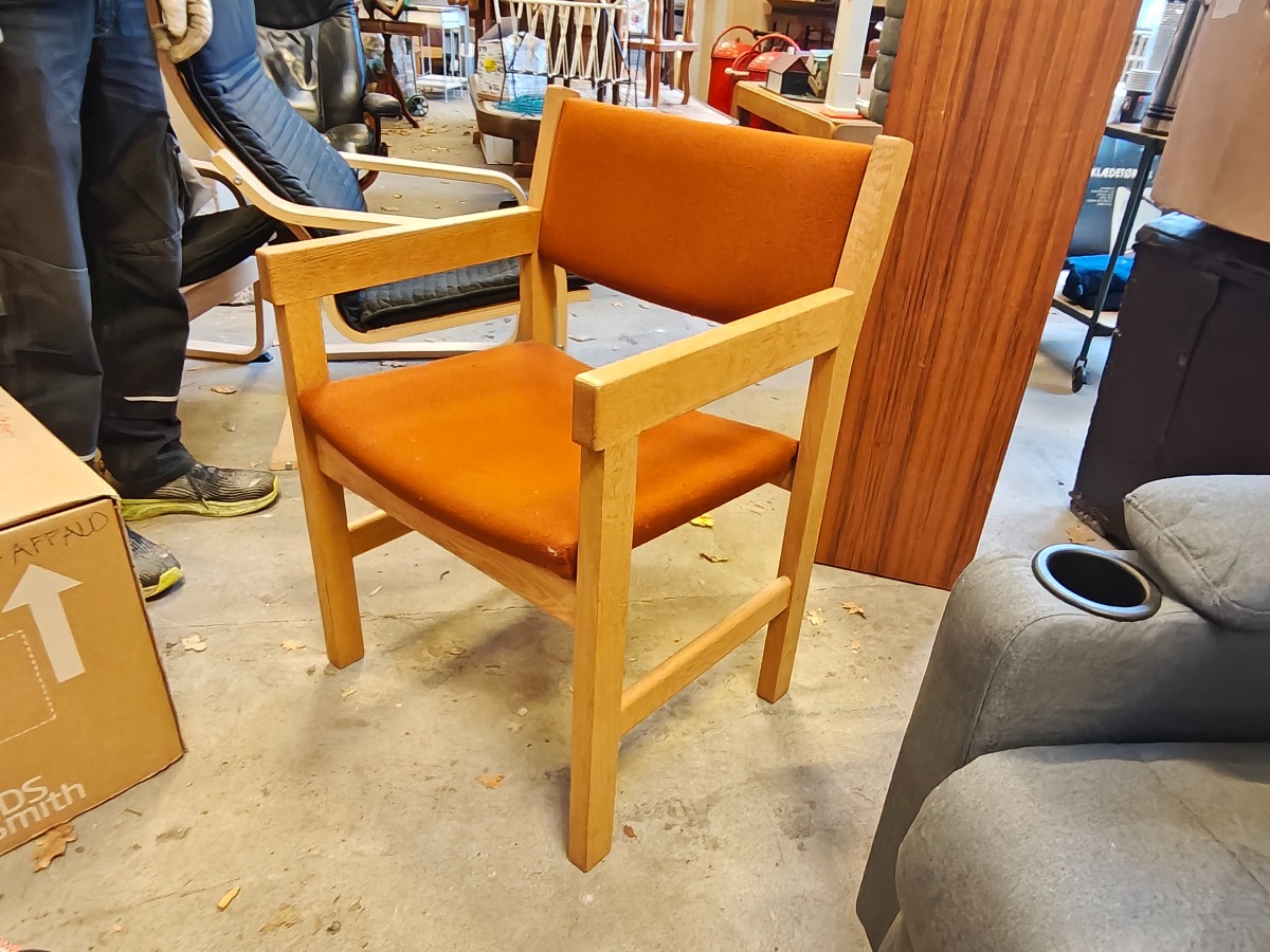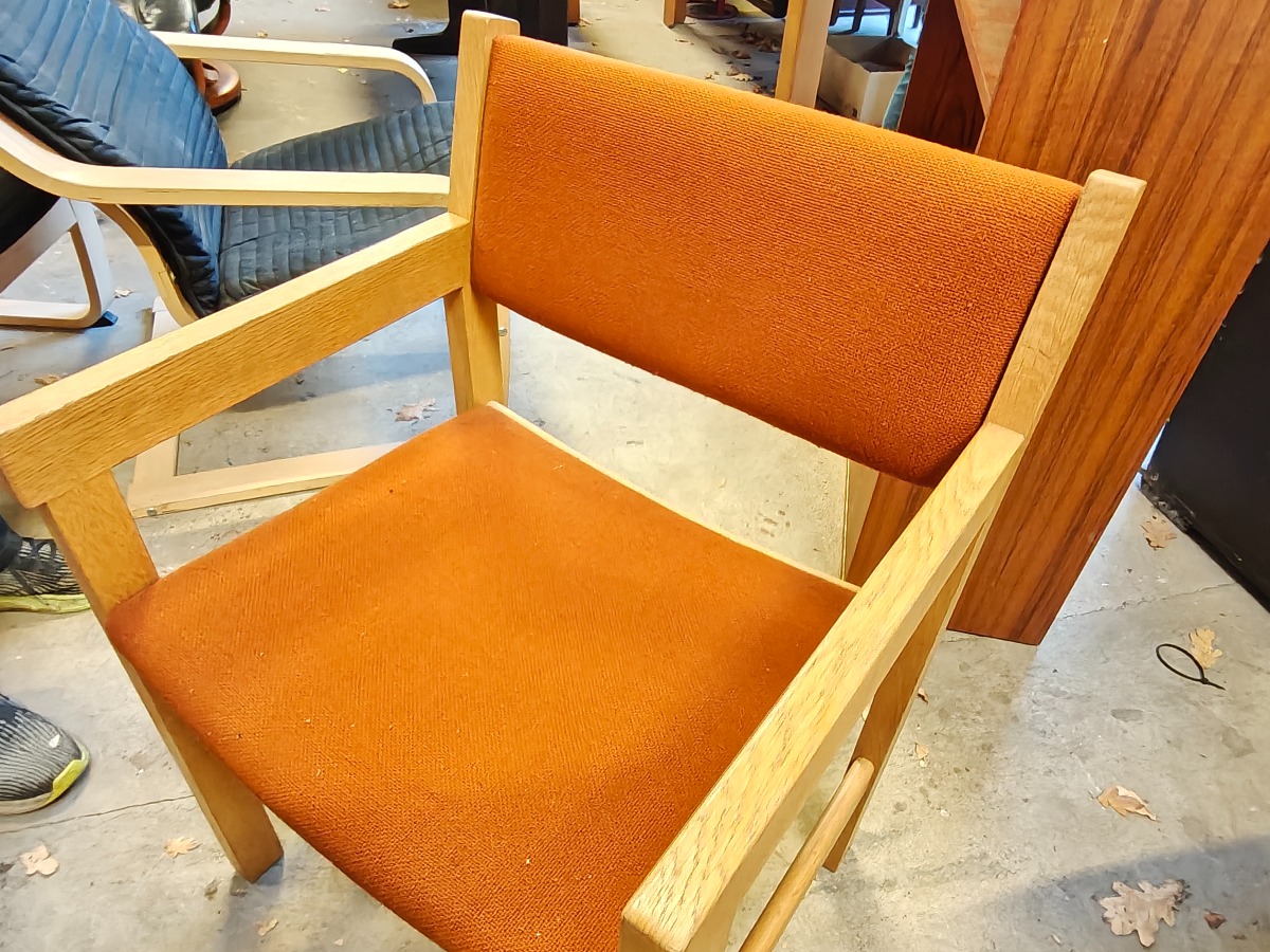 Hans J. Wegner GE151 armstol. Stel af eg monteret med orange kvadrat-stof. Fremstillet hos Getama.