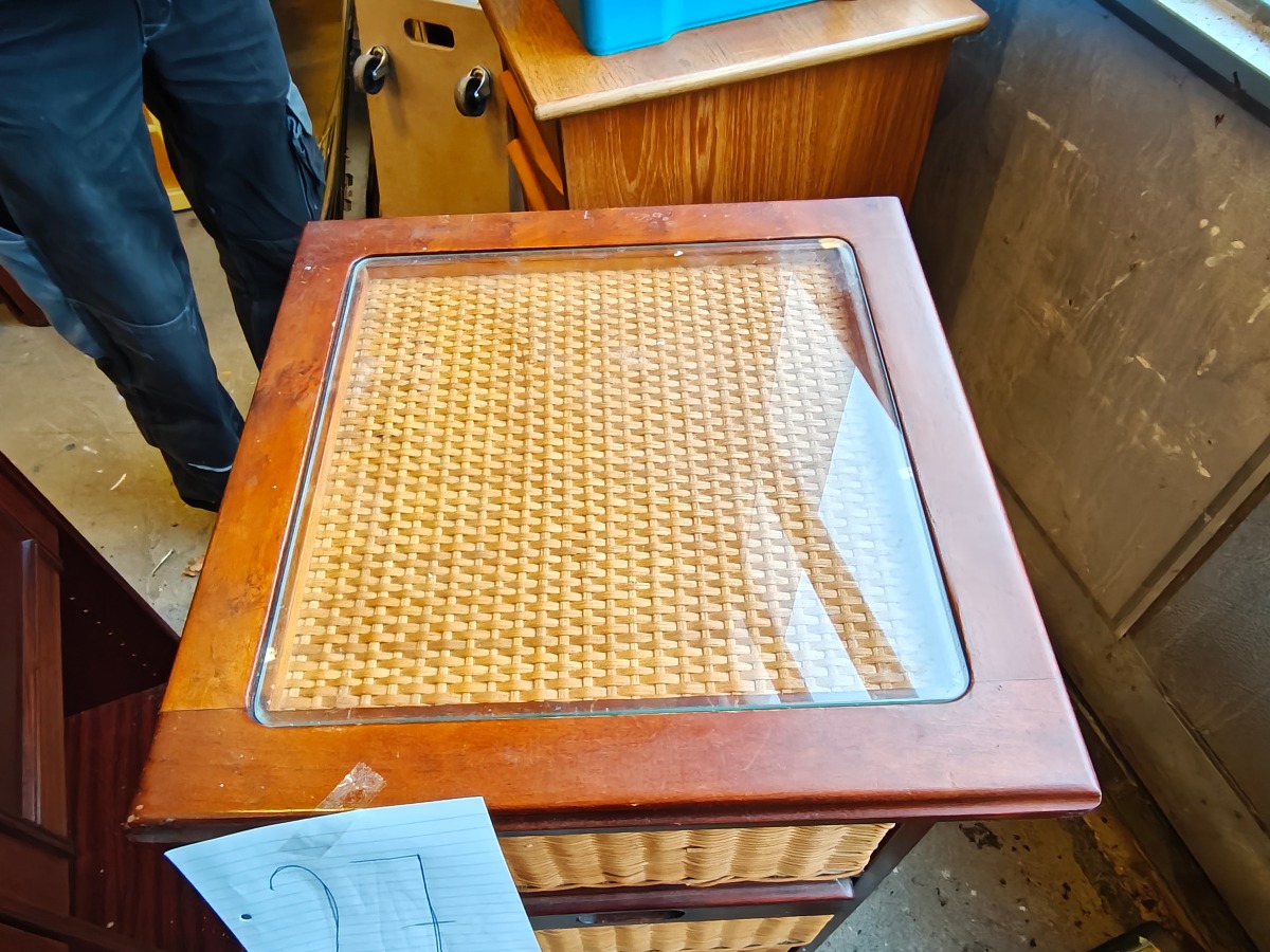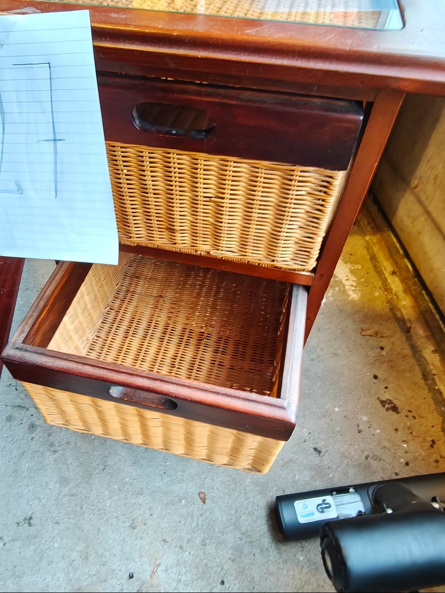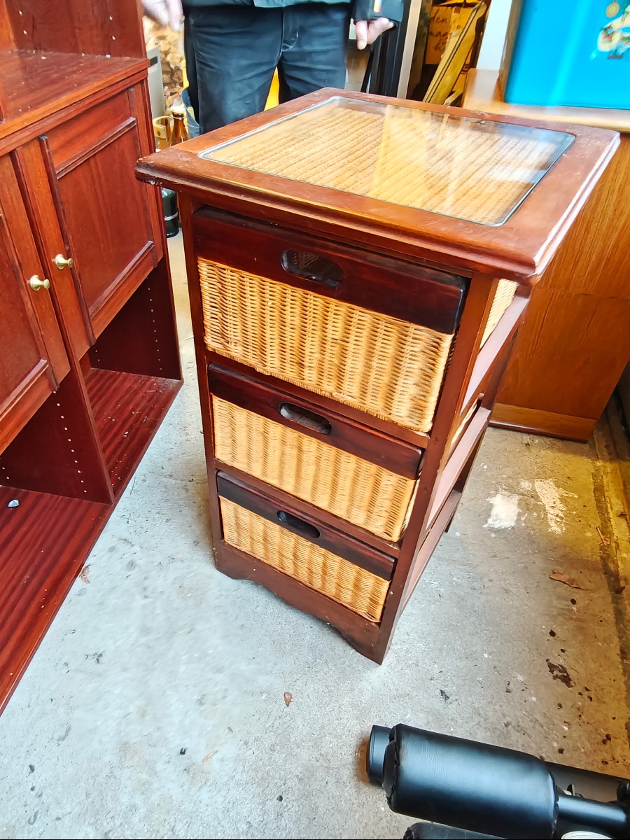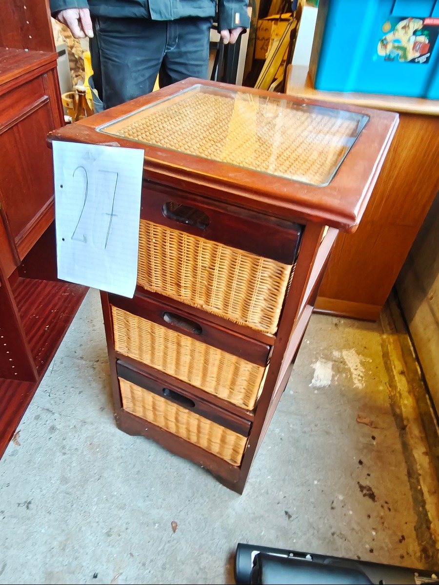 Lille kommode af mørkbejdset træ med 3 skuffer af rattan. Topplade af glas.