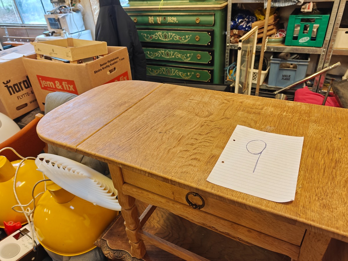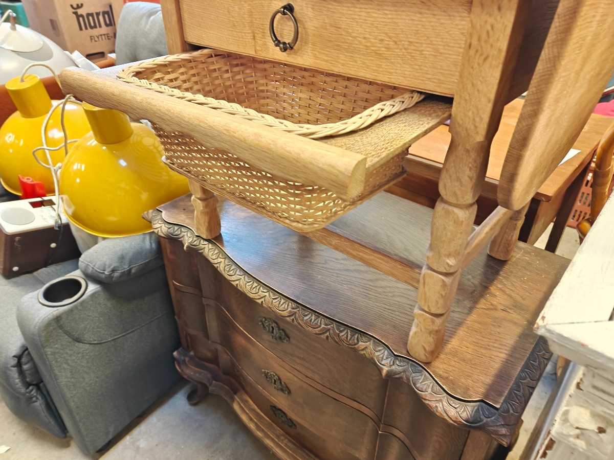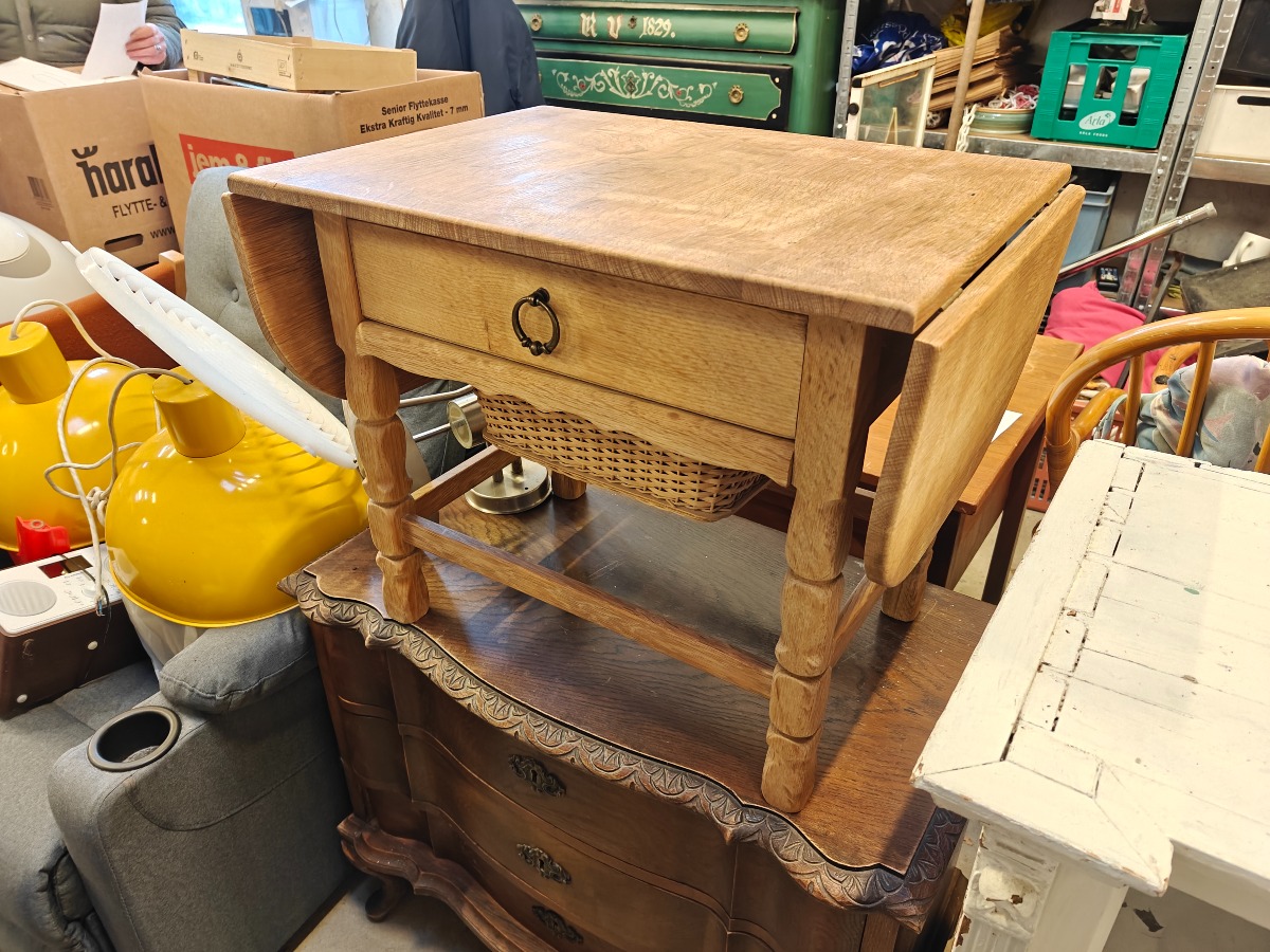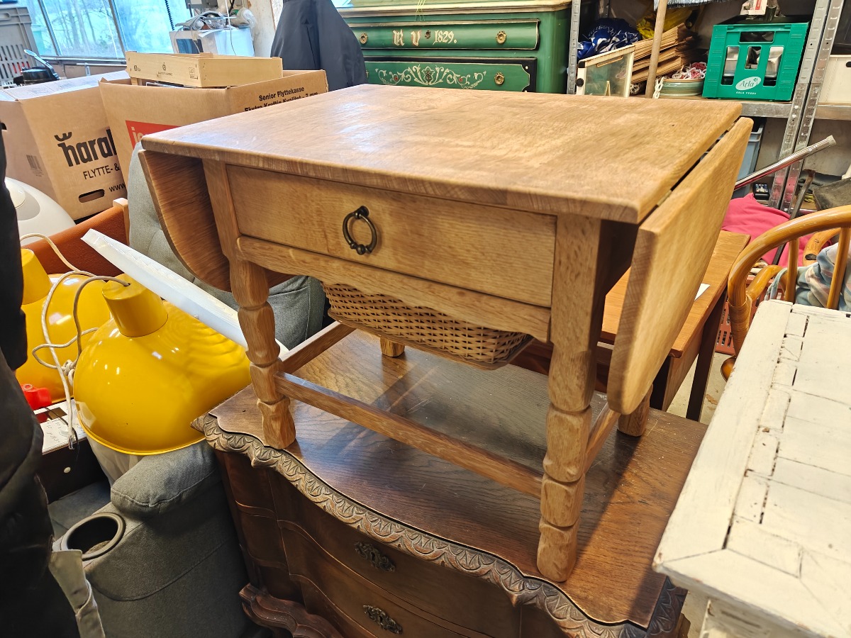 Lille sybord af syret eg. Flettet garnkurv og skuffe i front. Topplade 60 x 40 cm. Sideklapper B. 22 cm.