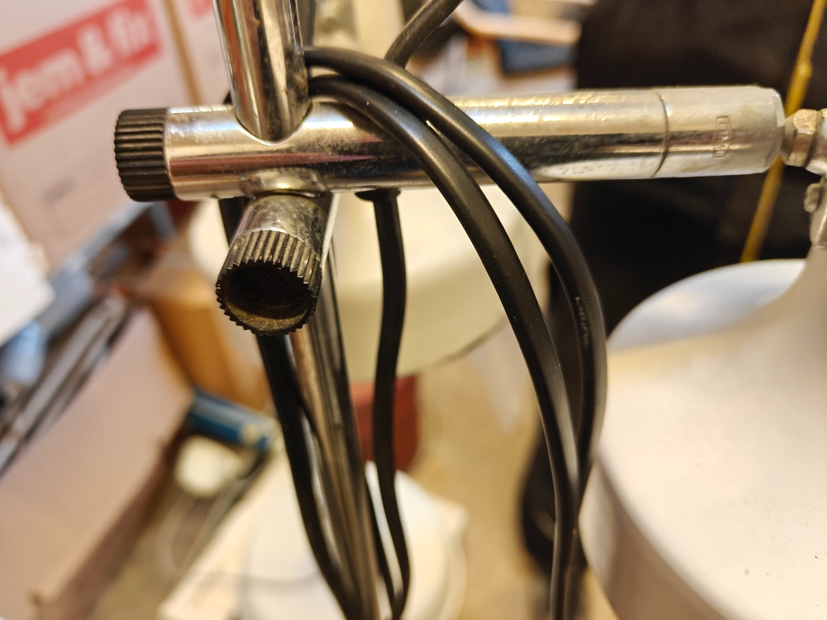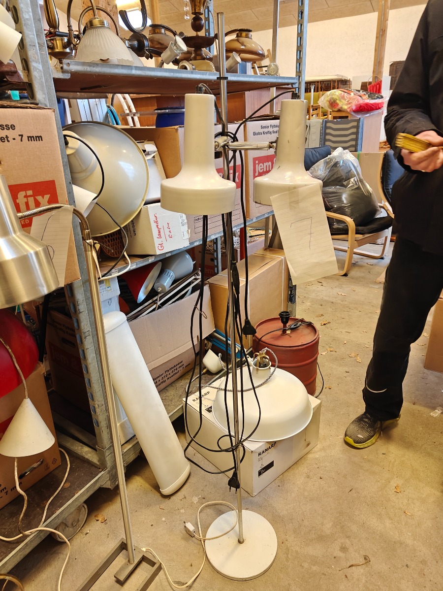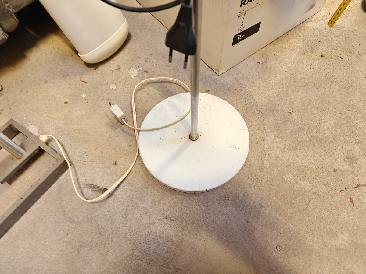 Standerlampe med 2 skærme af hvidlakeret metal. H. ca. 140 cm. Aldersrelateret patina.
