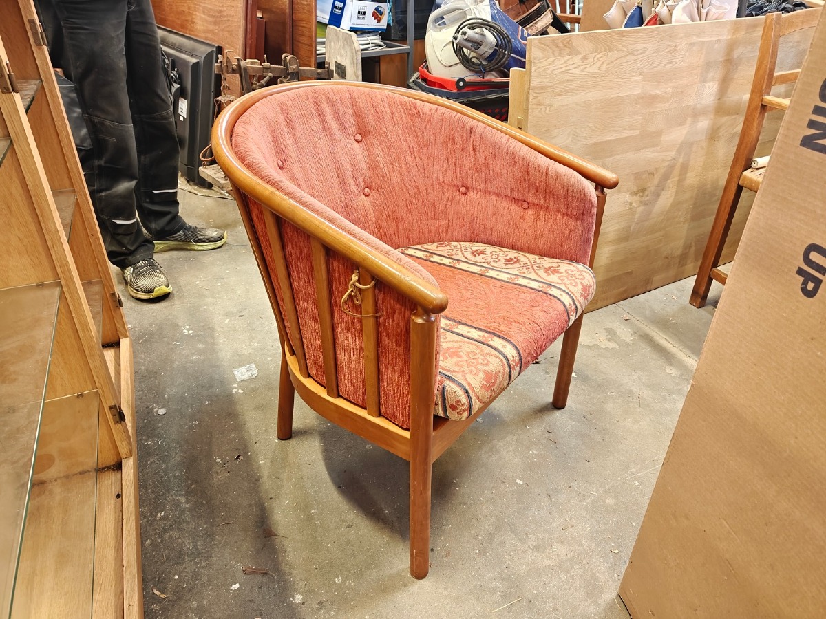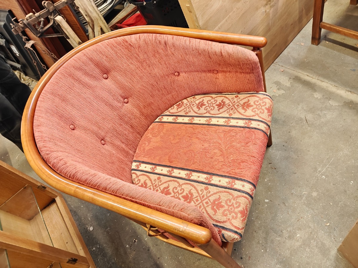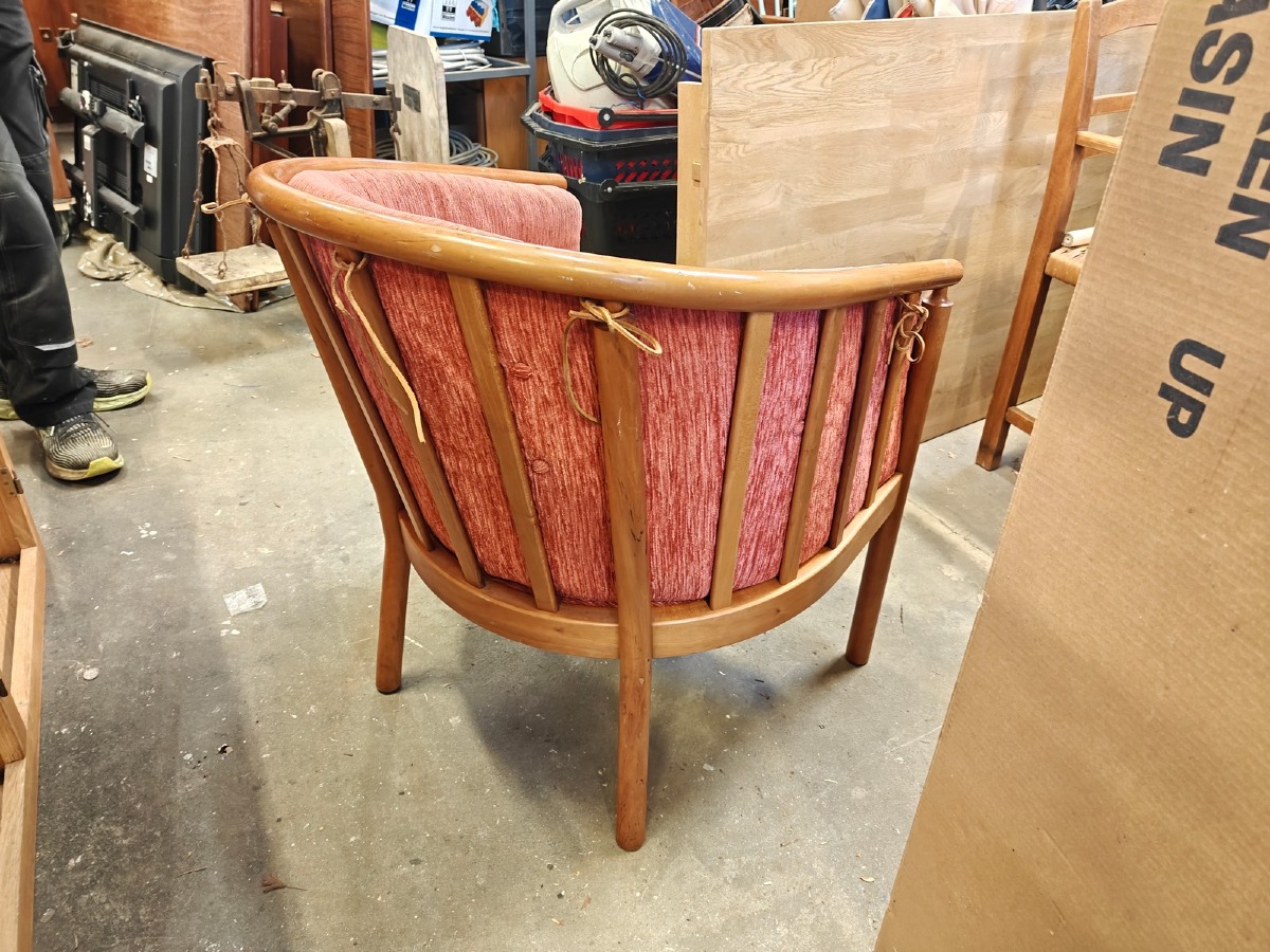 Stouby Bella hvilestol af kirsebær med tremmeryg. Løse hynder i rosa farver.