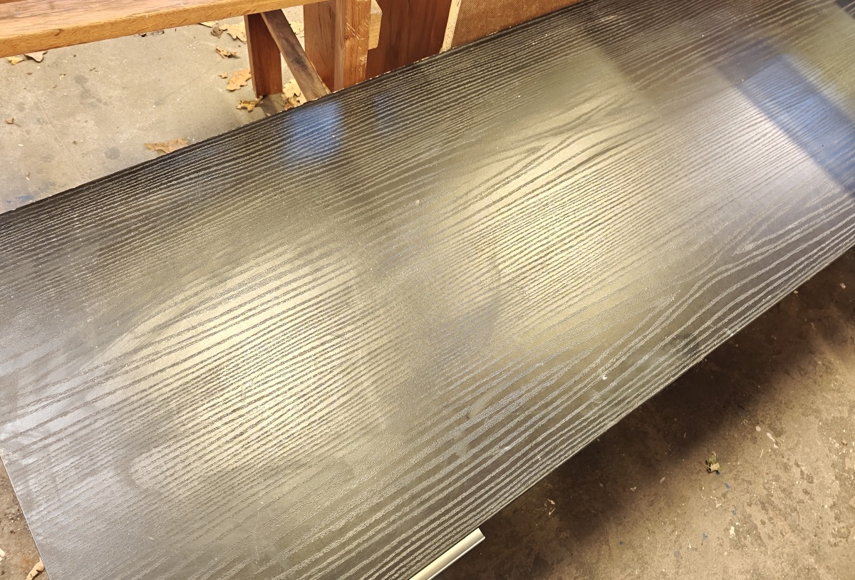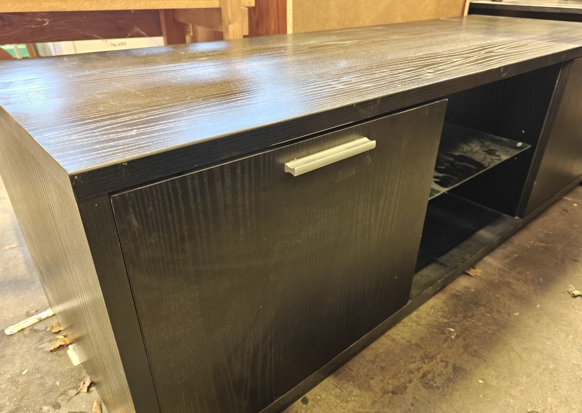 TV-bænk med sortlamineret overflade. Front med 2 skabe og hylde. 140 x 45 x 48 cm.