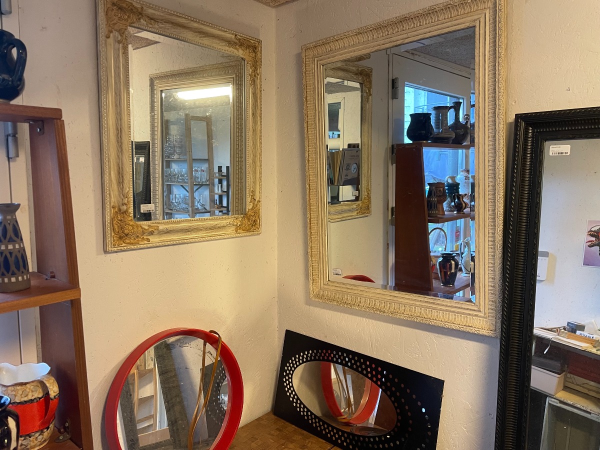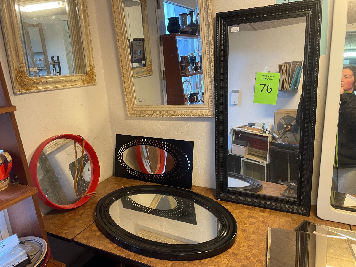 12 spejle i forskelig design og matriale. Den største måler 120 x 50cm