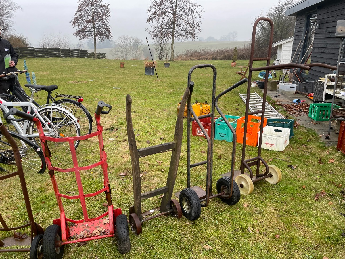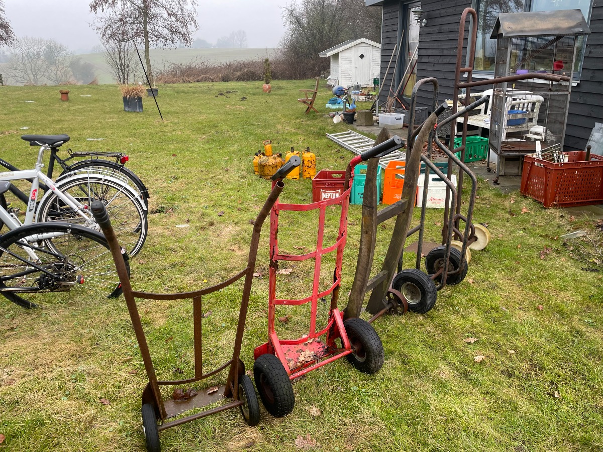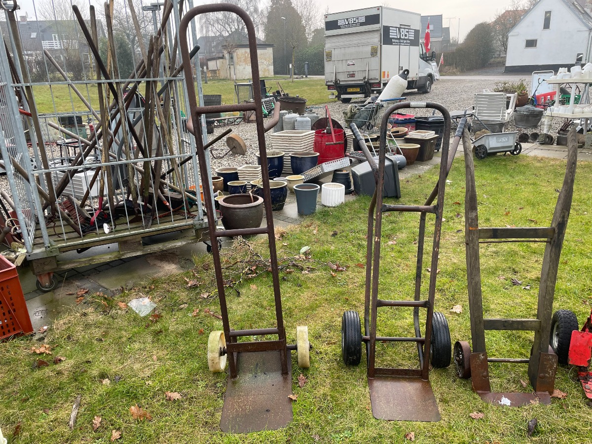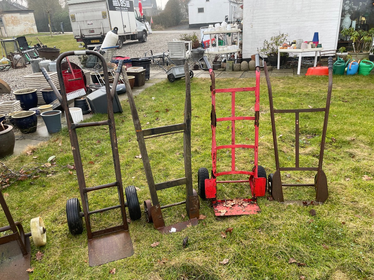 5 sækkevogne af forskellig design. Den største måler B: 42cm D: 99cm H: 160m.
