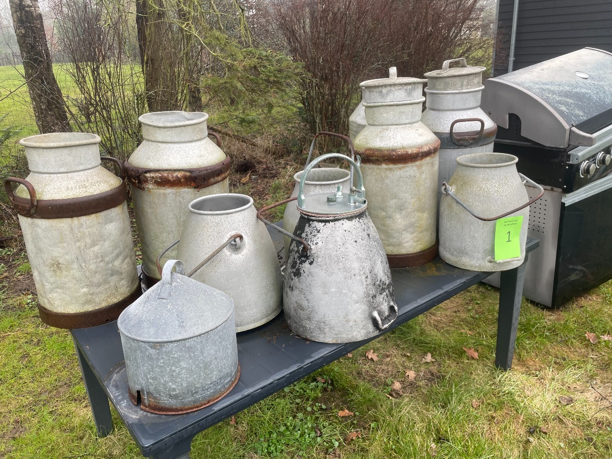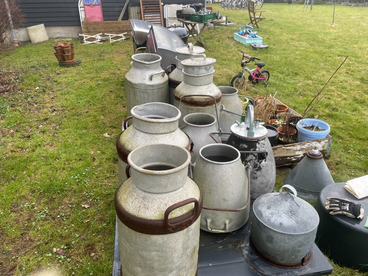 5 store mælkejunger. 2 har låg. 4 mindre mælkejunger. 1 “top”