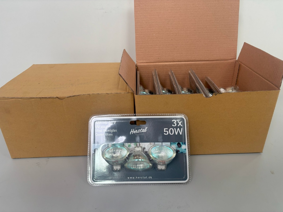 2 kasser med 10 pakker MR 16 Herstal pærer med UV stop, frontglas og cover glas. 50W. 3 stk. i hver pakke. Ubrugte, fra lampeforhandler.