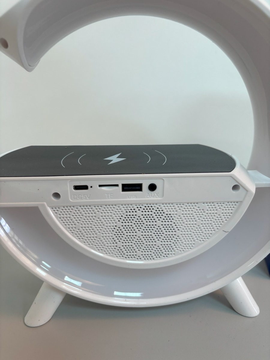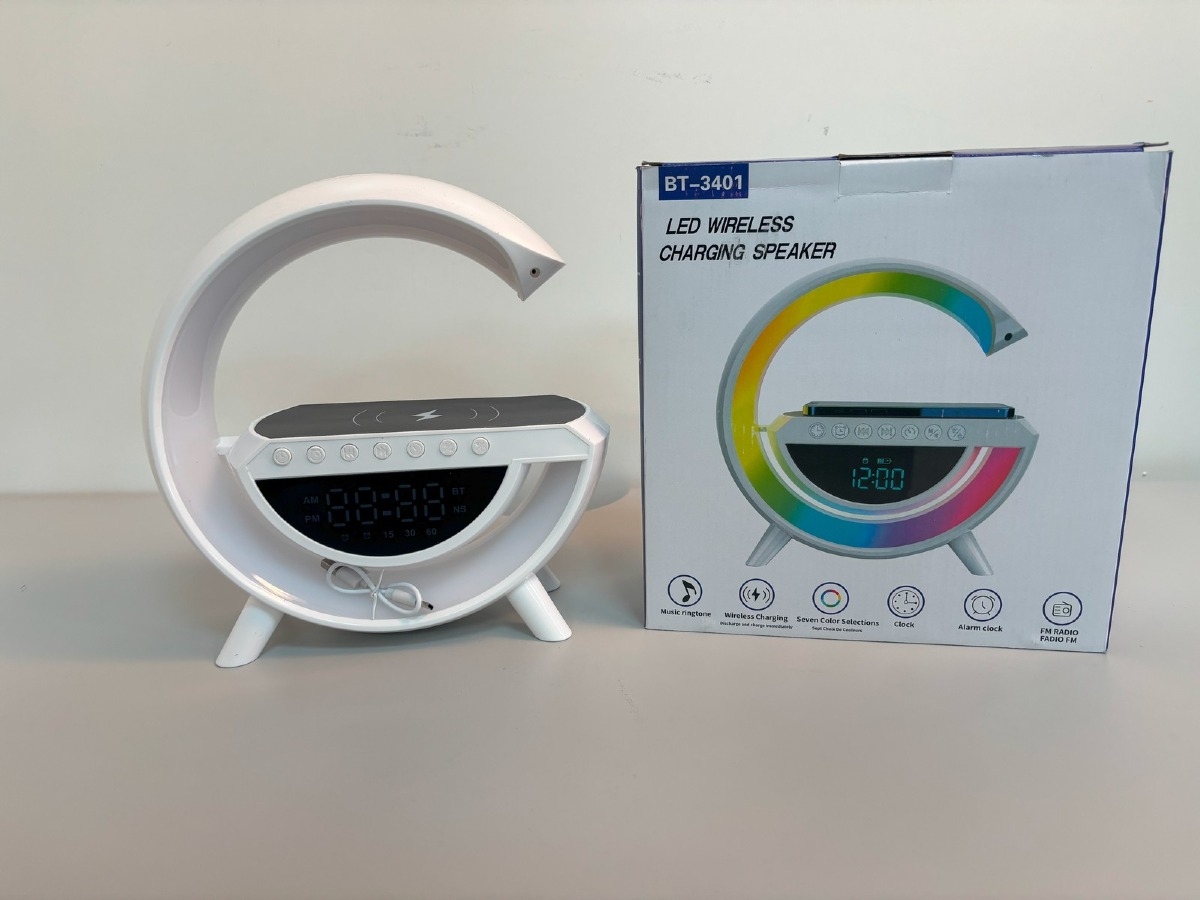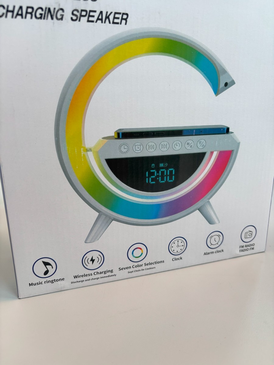 LED wireless charging speaker. Med trådløs opladning til din mobil, alarm, klokke, FM radio, mm. Ubrugt