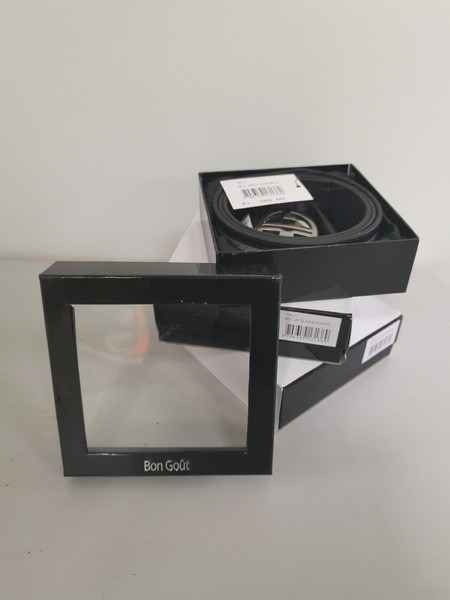 Unisex bælter i læder, med smart metal spænde og stof indlæg med påskriften BG. 4 stk. Ny pris kr. 399,00 pr. stk. Alle i original emballage
