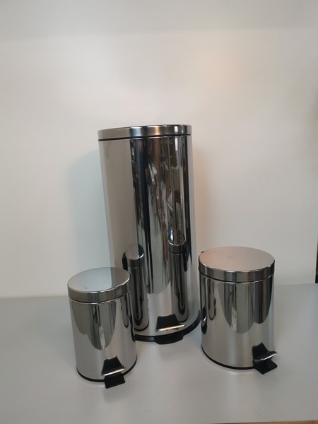 Pedalspande sæt med 3 spande i blank stål look. 3 ltr. 5 ltr. og 30 ltr. Spandene har alle spande indsats der kan løftes ud ved tømning. Ubrugt