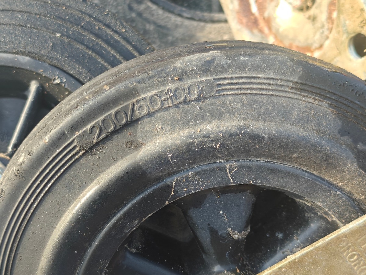 12 Transport-/industrihjul. Rotérbare med bremse. Mål: 200/50-100 (ø20 cm). Fotos viser nogle af de udbudte hjul. Udleveres som 'plukkevarer'/assorterede. Brugte.