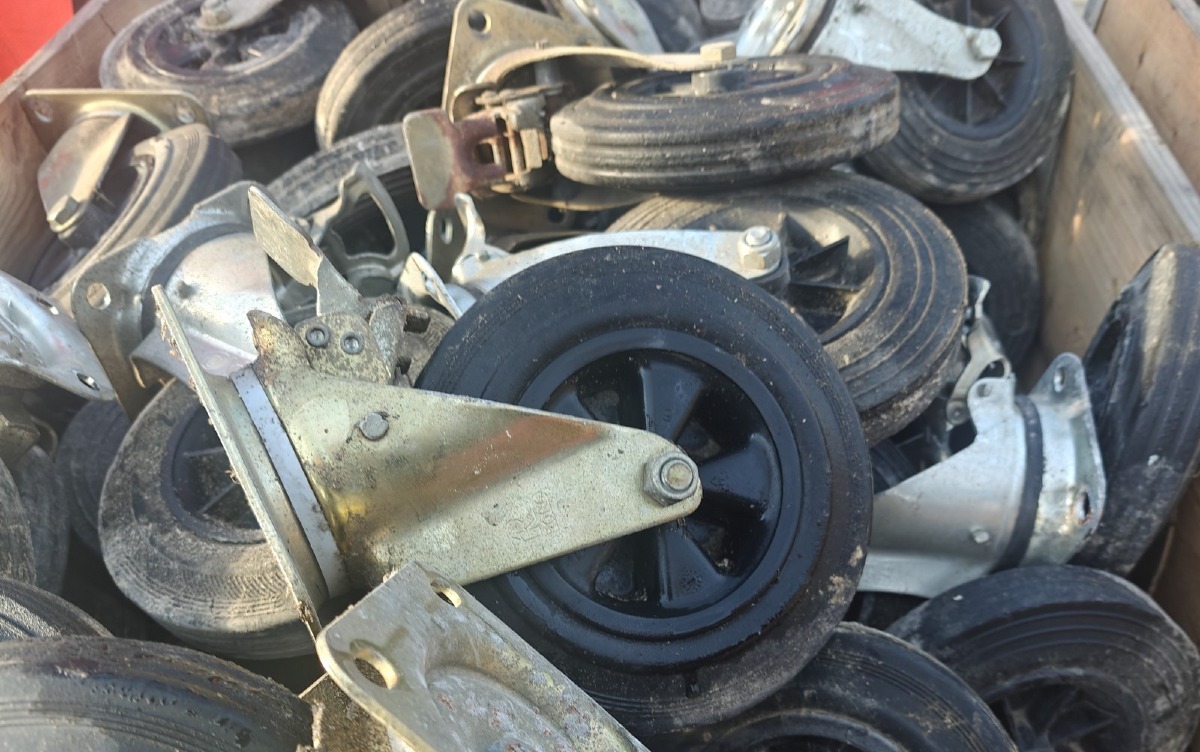 24 Transport-/industrihjul. Rotérbare med bremse. Mål: 200/50-100 (ø20 cm). Fotos viser nogle af de udbudte hjul. Udleveres som 'plukkevarer'/assorterede. Brugte.