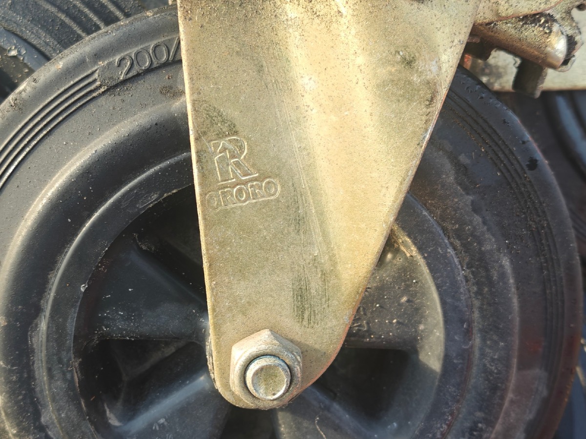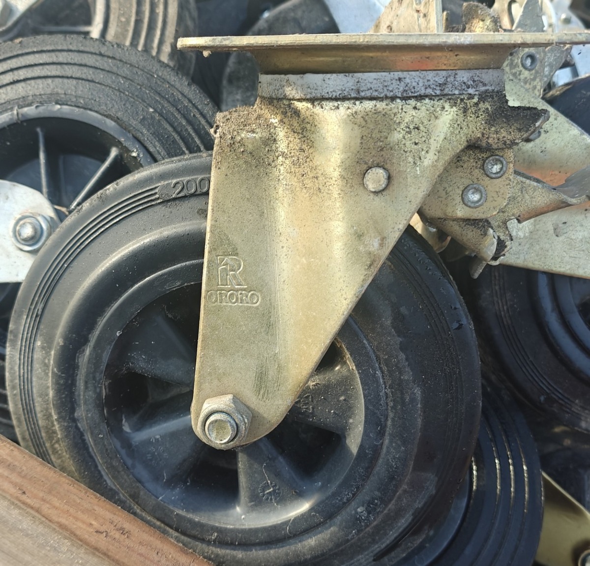 36 Transport-/industrihjul. Rotérbare med bremse. Mål: 200/50-100 (ø20 cm). Fotos viser nogle af de udbudte hjul. Udleveres som 'plukkevarer'/assorterede. Brugte.