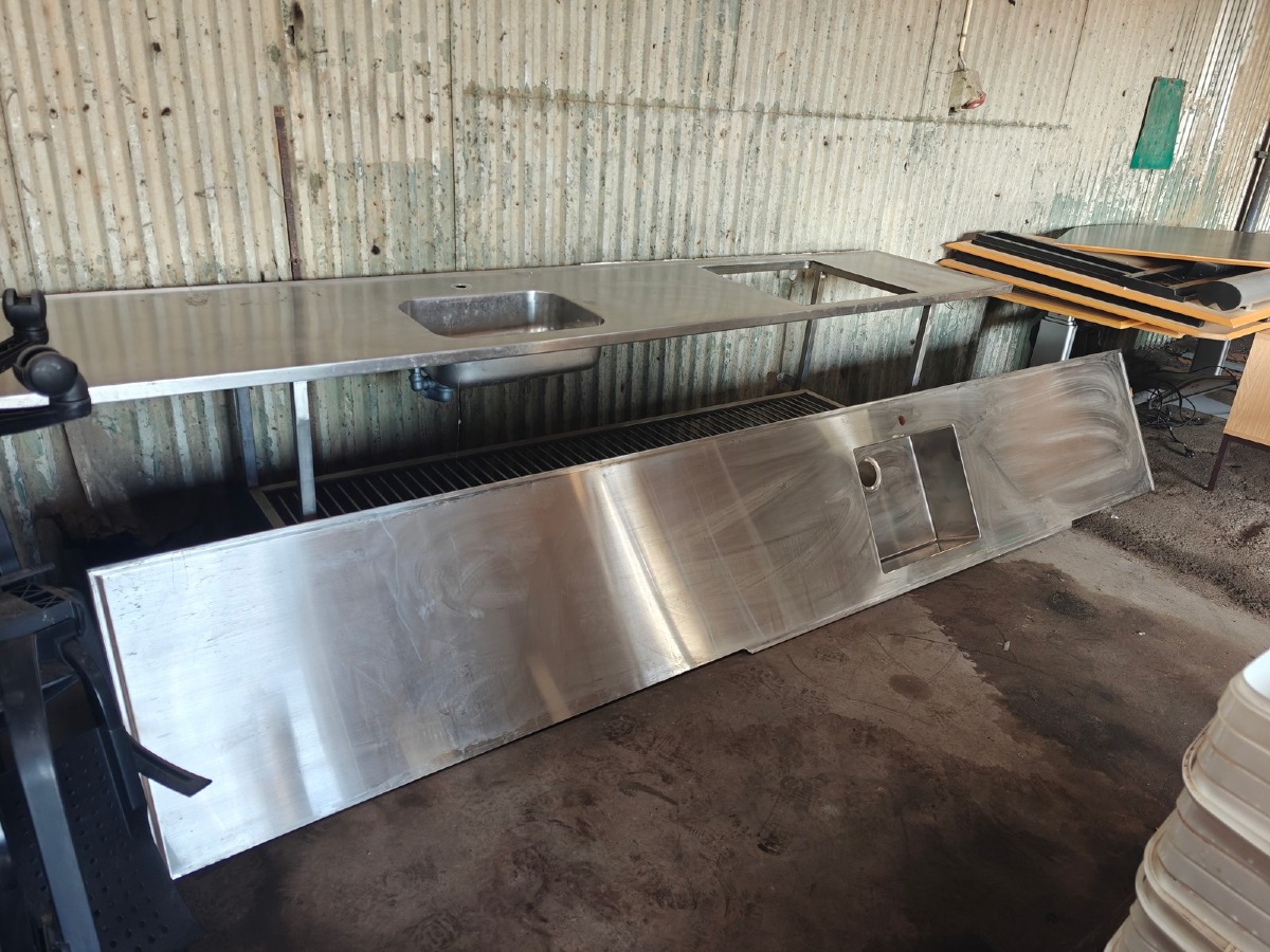 "Rustfrit stålbordplade m/vask. Mål: L: 367 cm. D: 60 cm