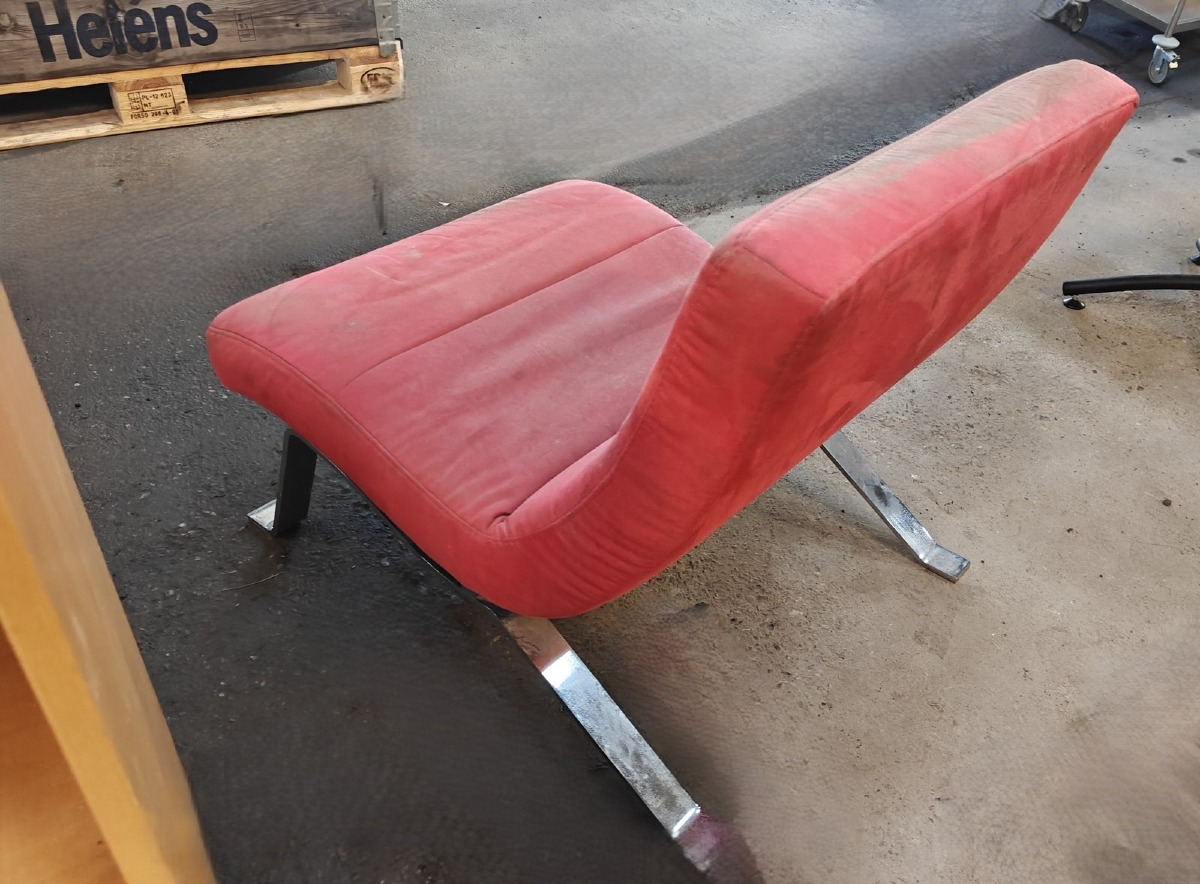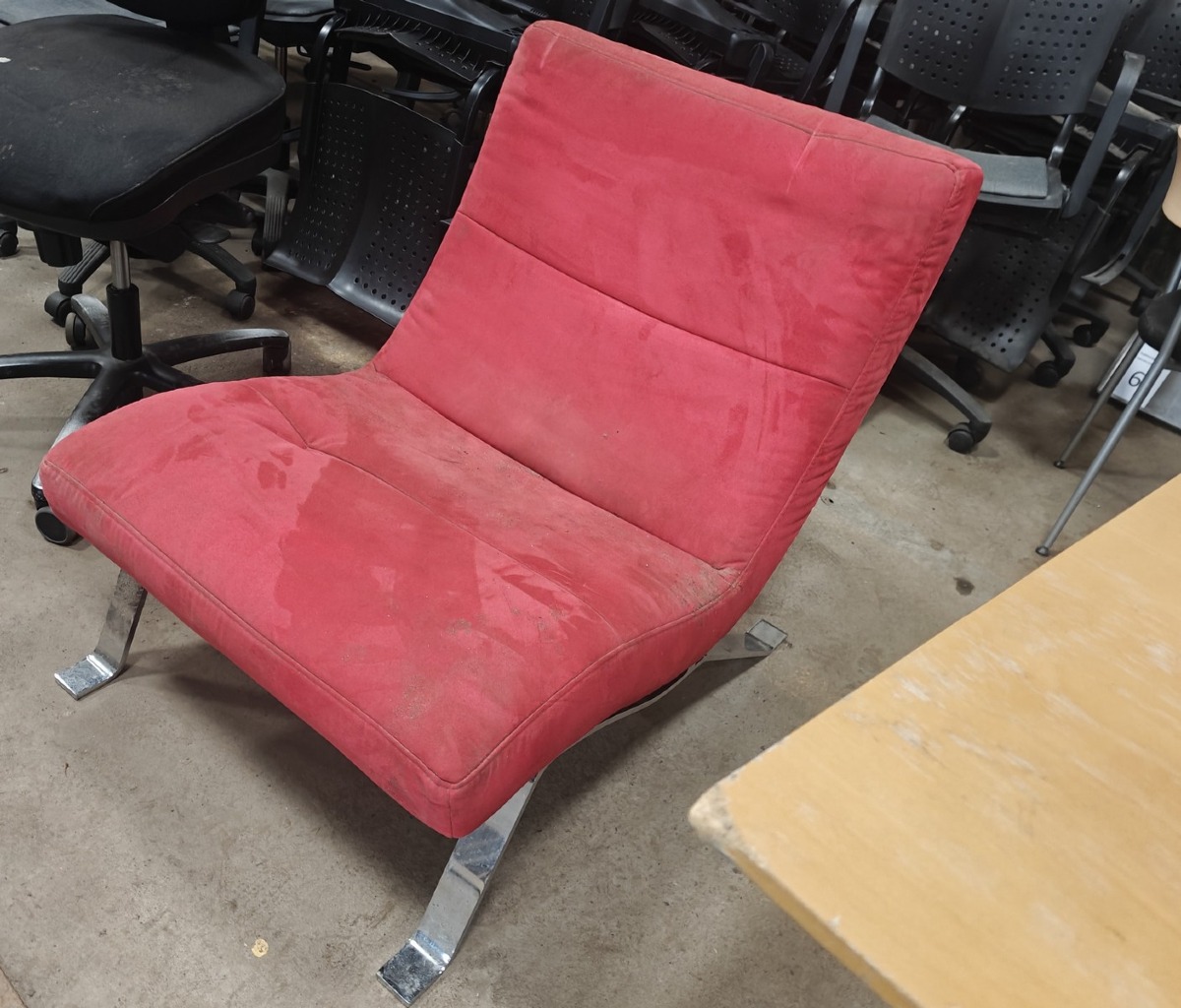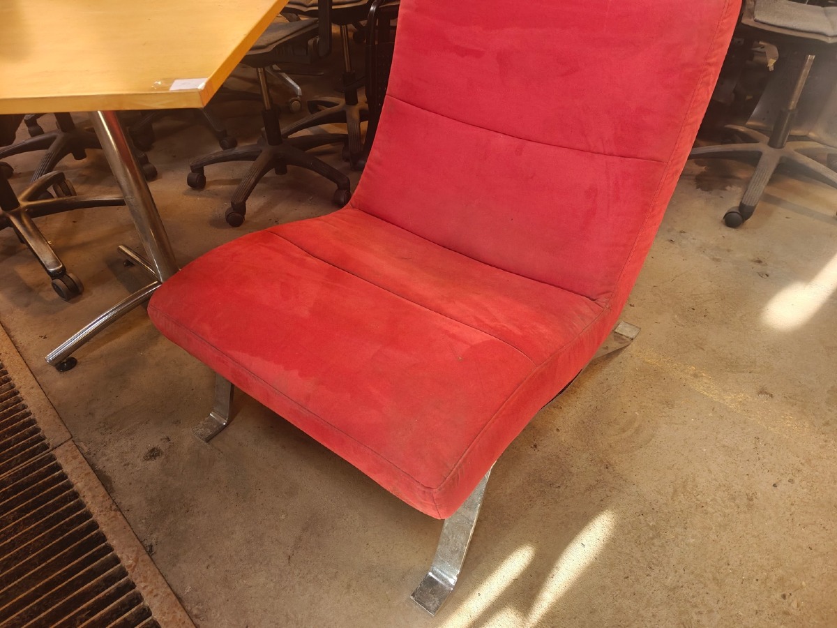 Bord og loungestol. Rød loungestol m/kromfarvet stel