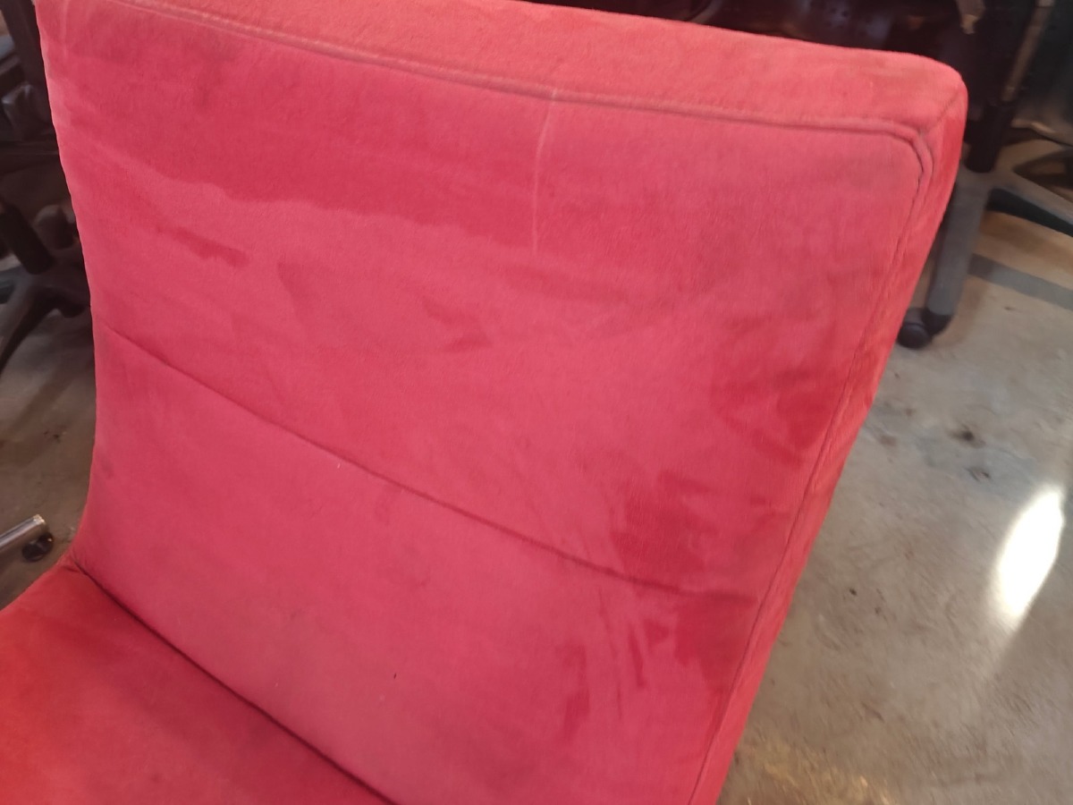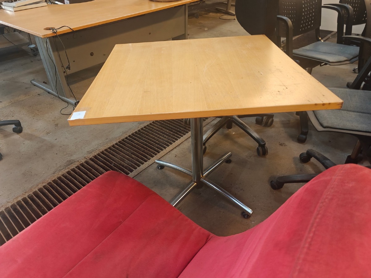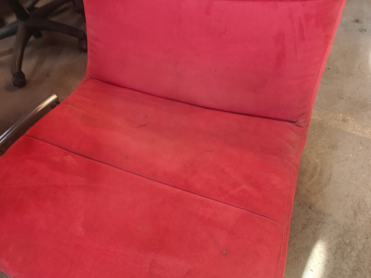 "Bord og loungestol. Rød loungestol m/kromfarvet stel. Polstret sæde og ryg. Pletter på betræk. Bord: Mrk: EFG. Kromfarvet stel. Mål: 80 x 80 cm. H: 72 cm. Brugt. Evt. øvrige effekter på fotos medfølger ikke."