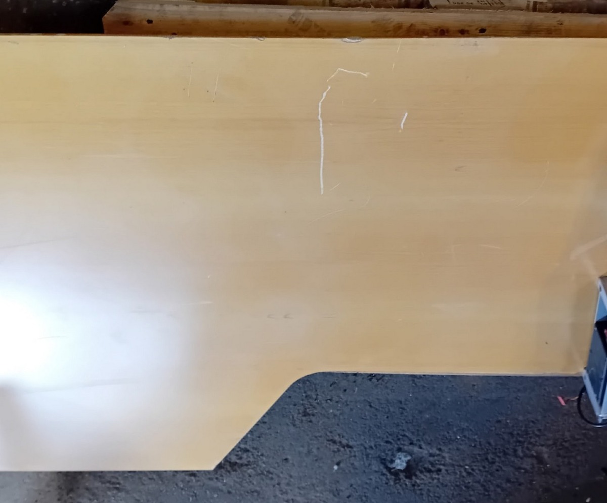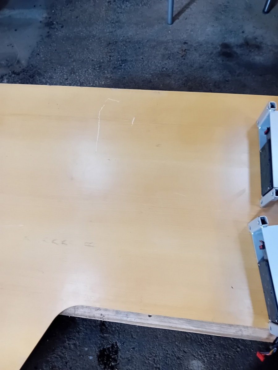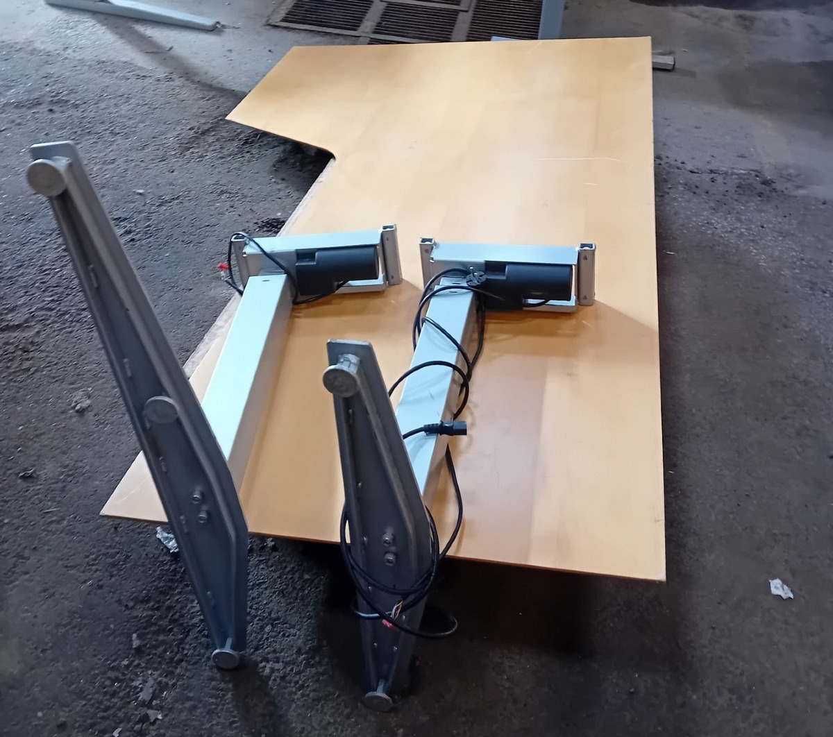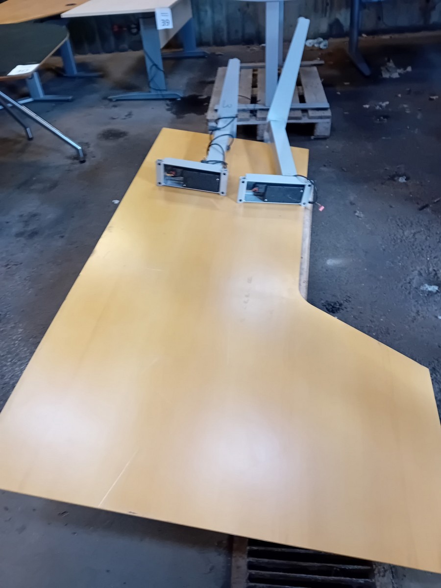 Hæve-/sænke skrivebord. Venstrevendt. Mål: 200 x 120/80 cm. Brugt.