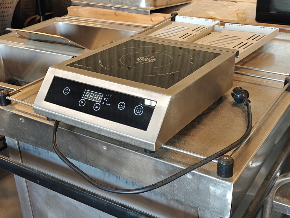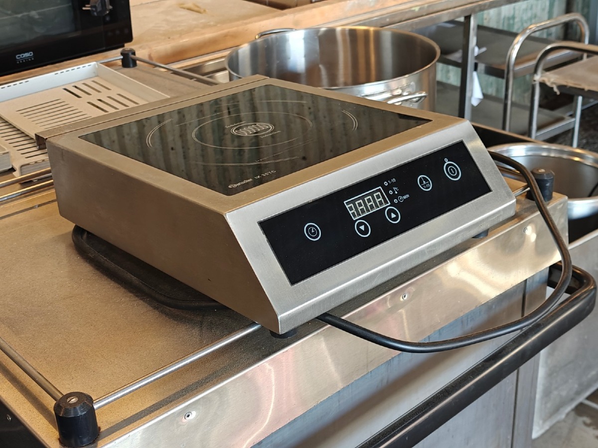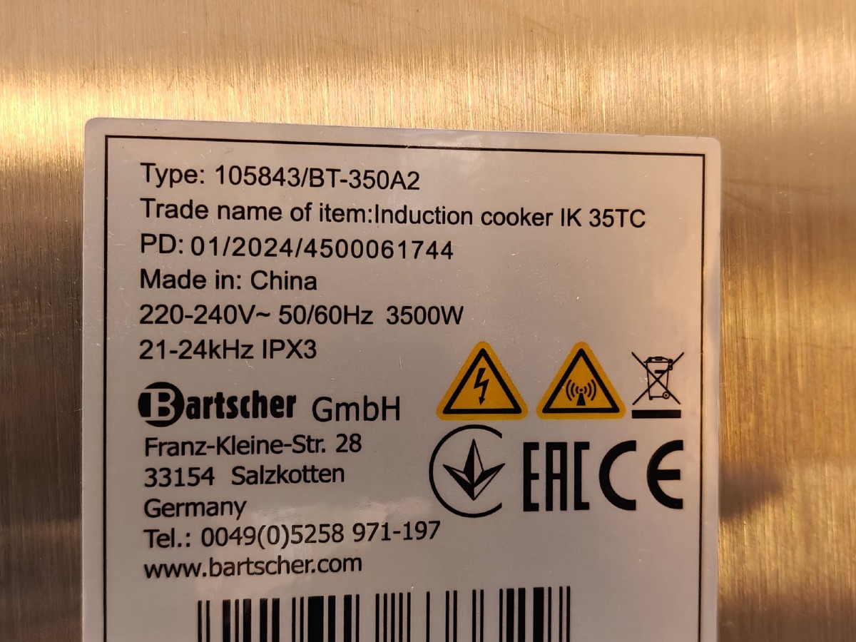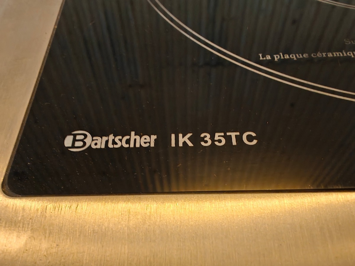 "Induktionskogeplade. Mrk: Bartscher. Model: IK 35TC. Type: 105843/BT-350A2. 220-240 V. Kabinet i rustfrit stål. 1 Kogezone. Brugt. Evt. øvrige effekter på fotos medfølger ikke."