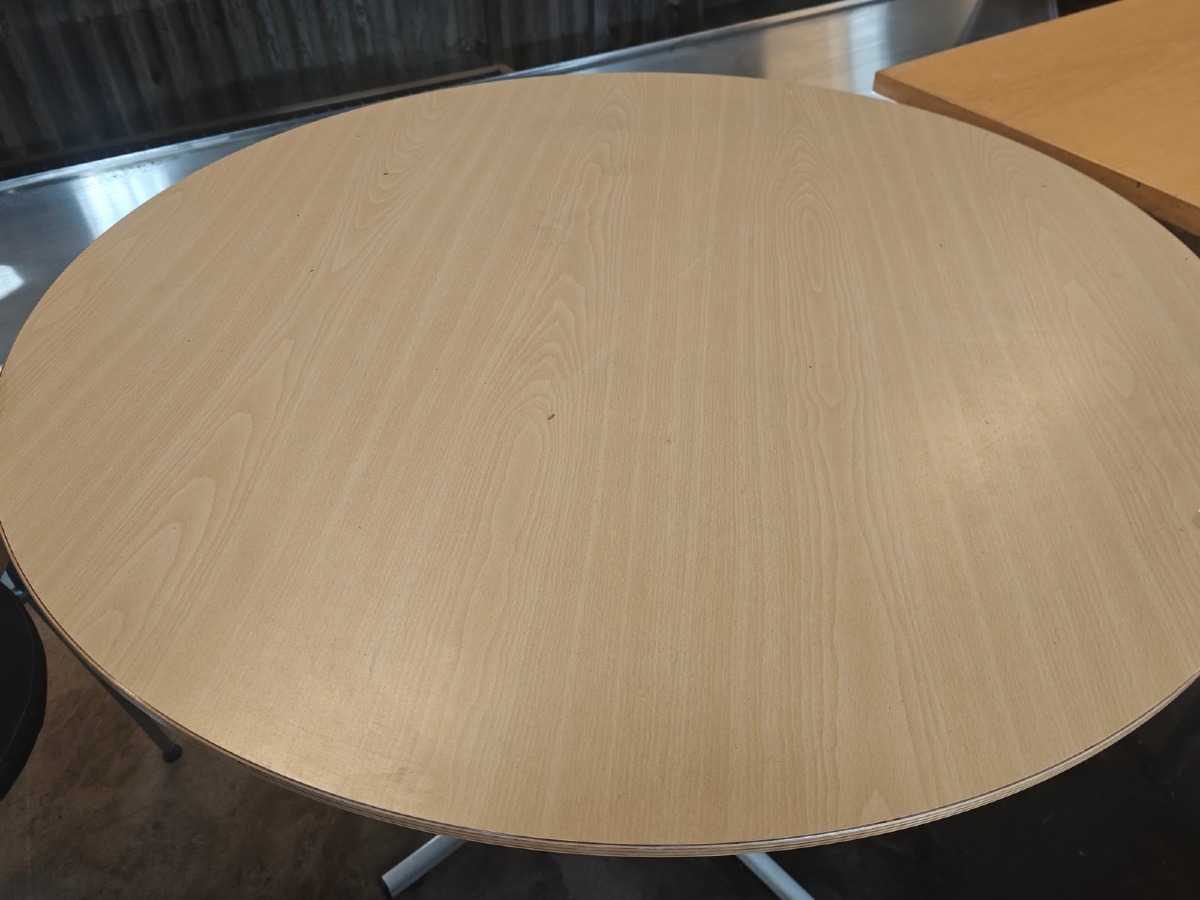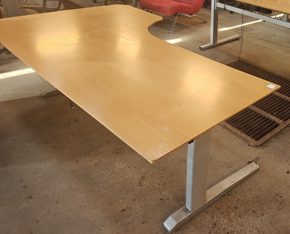 Mødebord & 2 hæve-/sænke skriveborde: Rundt mødebord. Mrk: EFG. Hvidt stel. Mål: ø100 cm. H: 73 cm. Brugt. 2 Hæve-/sænke skriveborde heraf 1 venstrevendt m/kabelhuller og 1 højrevendt. Brugte med brugsspor. Øvrige effekter på fotos medfølger ikke.