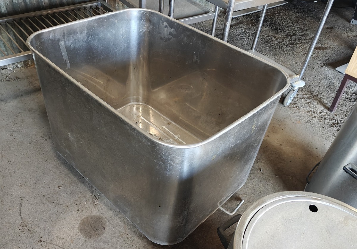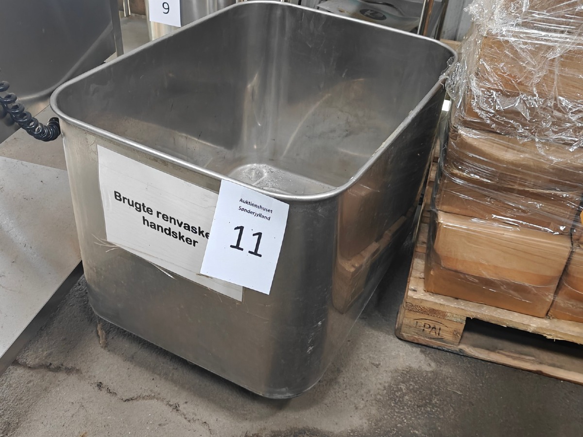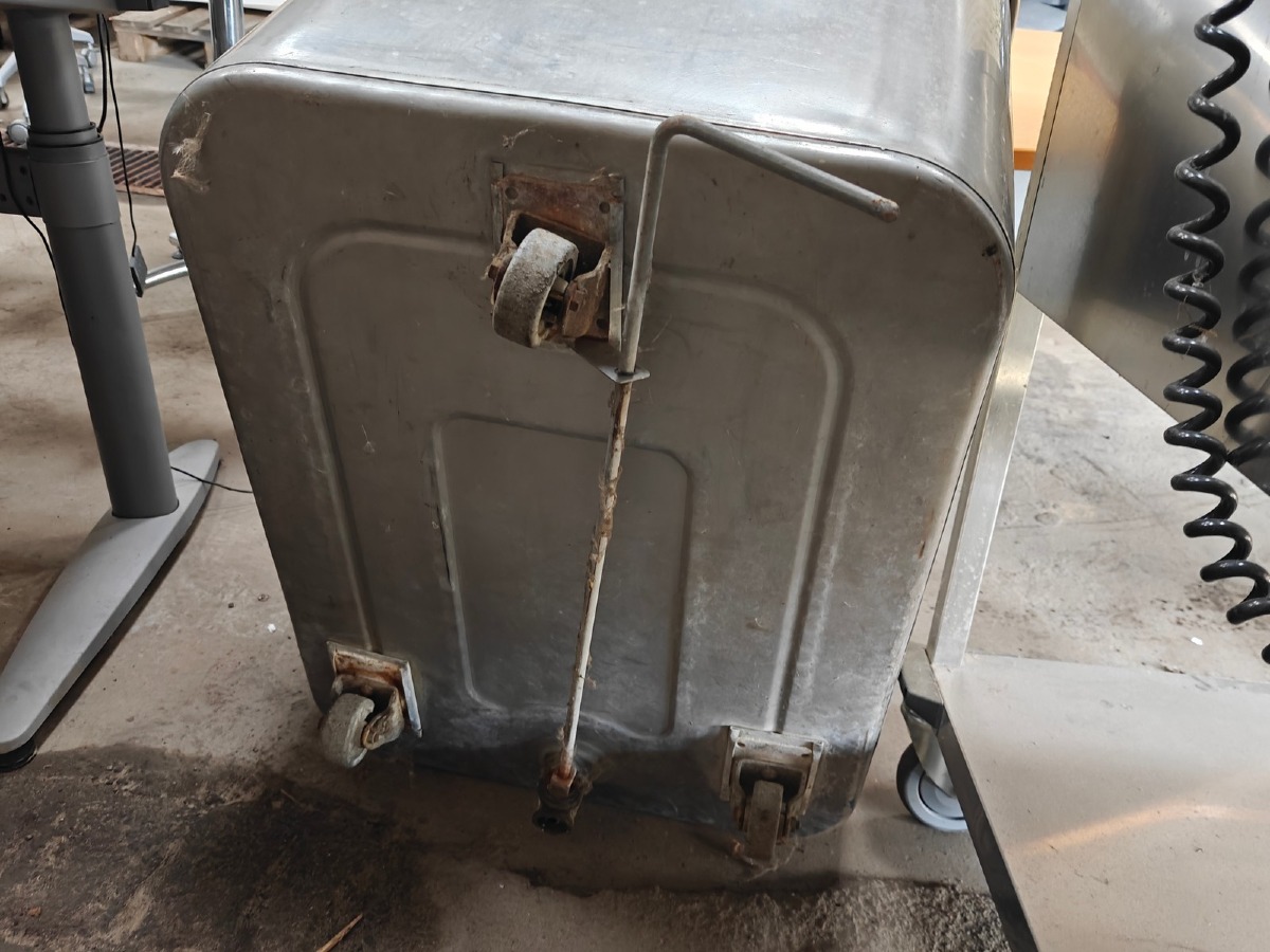 Rustfrit kar. Med afløb. På hjul. Mål: 80 x 58 cm. H: 58 cm. Brugt