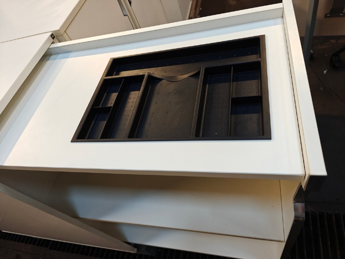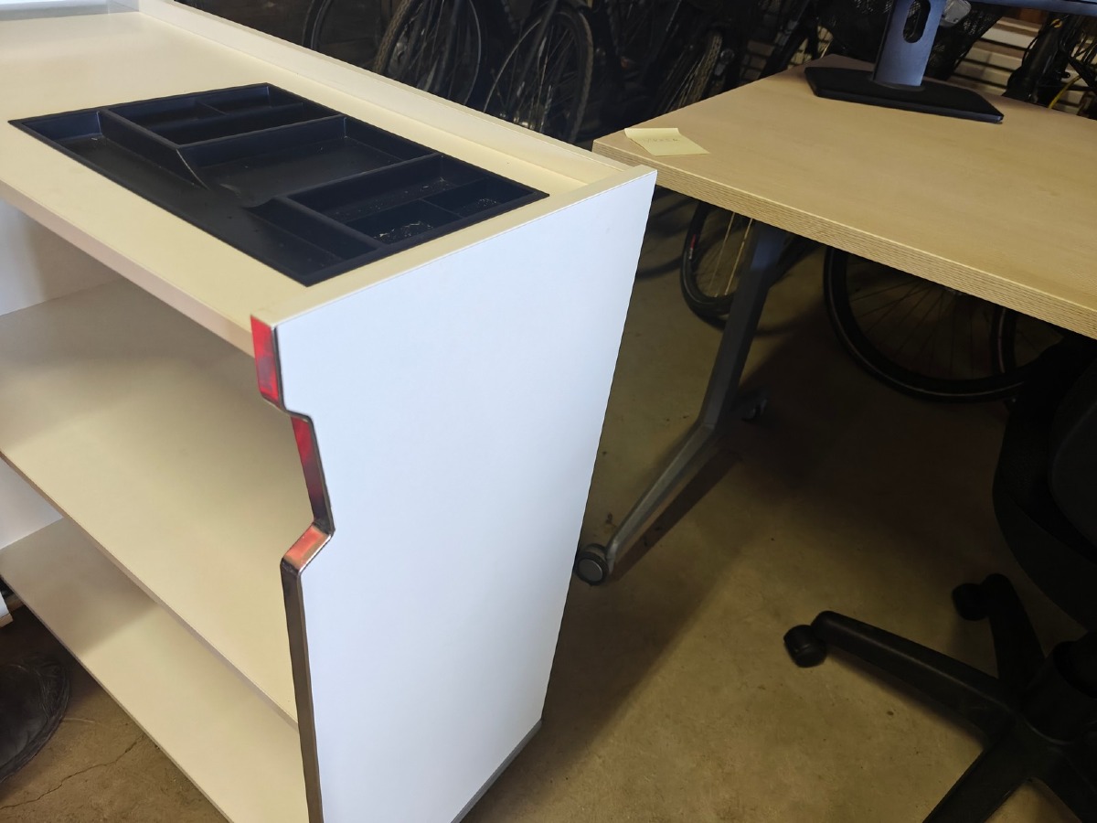 Udtræksskab. Mrk Holmris B8. Hvidt med stålskinne. Indrettet med pennebakke og hylde