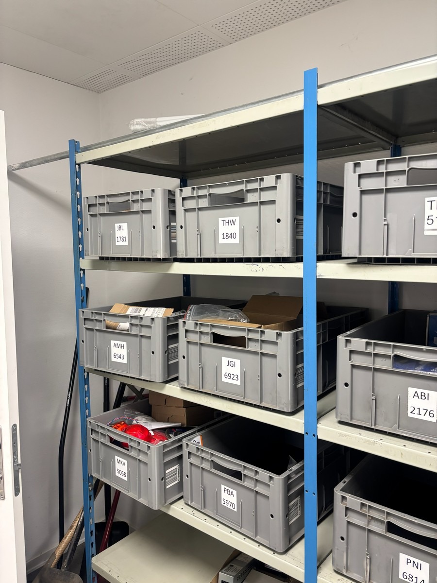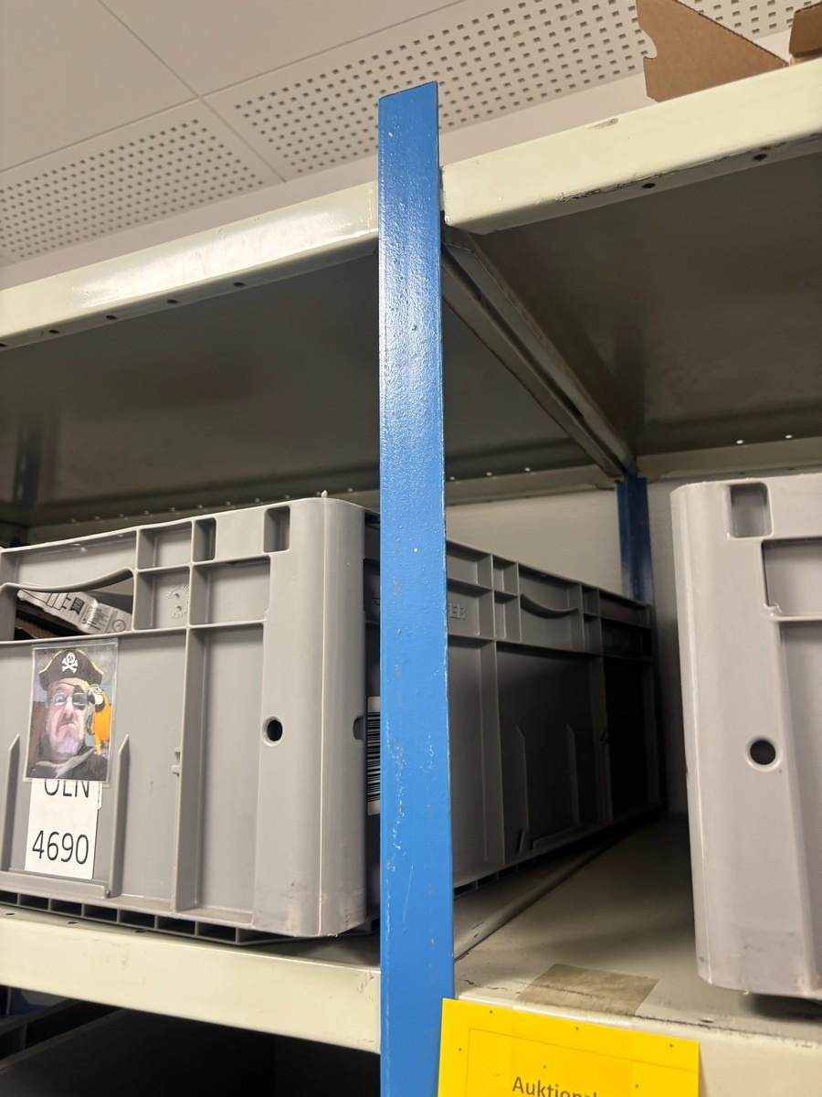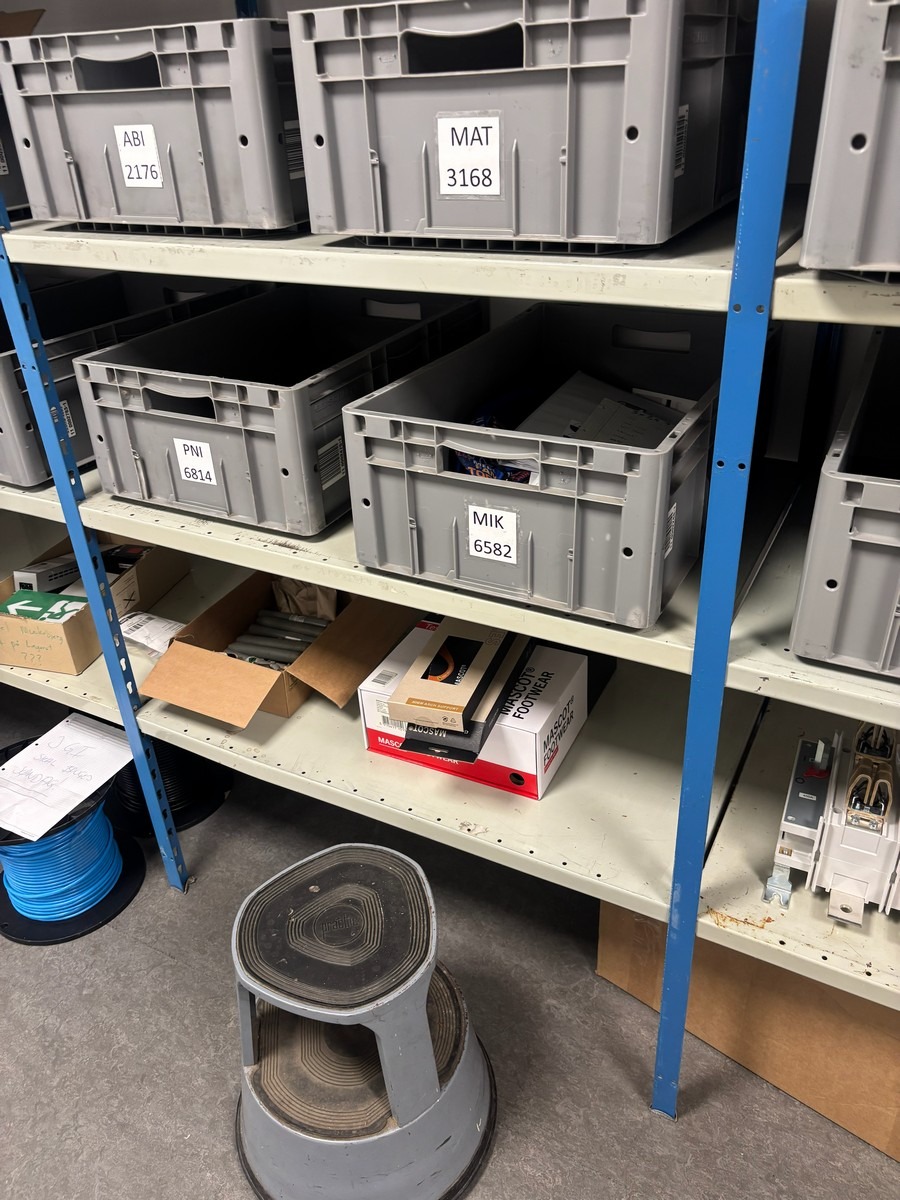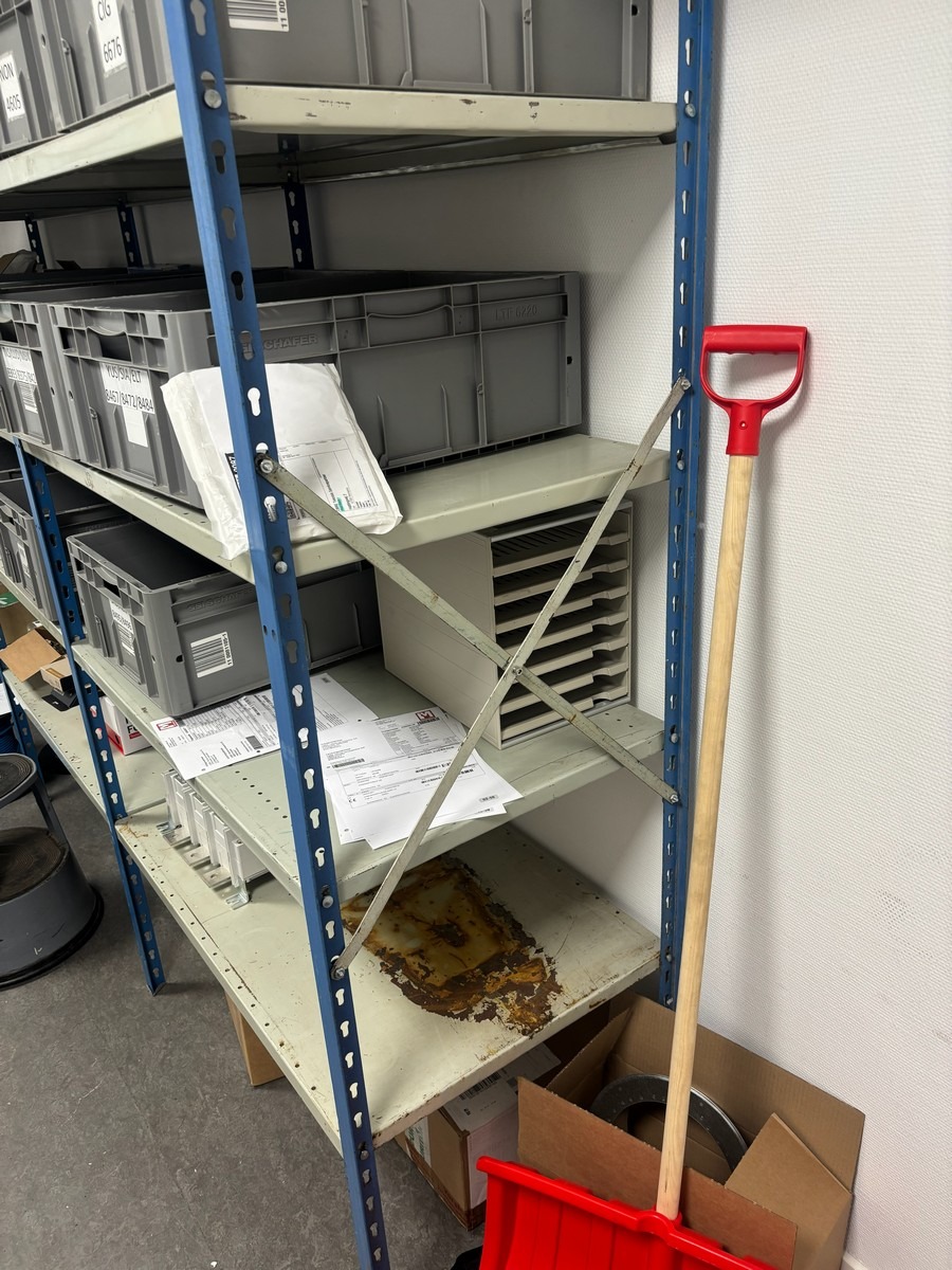 3 fags værksteds / lagerreol (Uden indhold - bliver tømt inden udlevering). Hver modul måler : 60 x 100 x 210 cm. Oprydning fra virksomhed