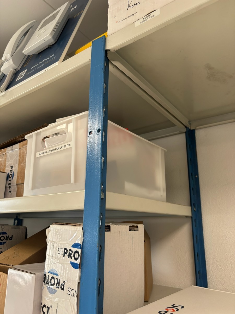 5 fags værksteds / lagerreol (Uden indhold - bliver tømt inden udlevering). Hver modul måler : 50 x 100 x 210 cm. Oprydning fra virksomhed