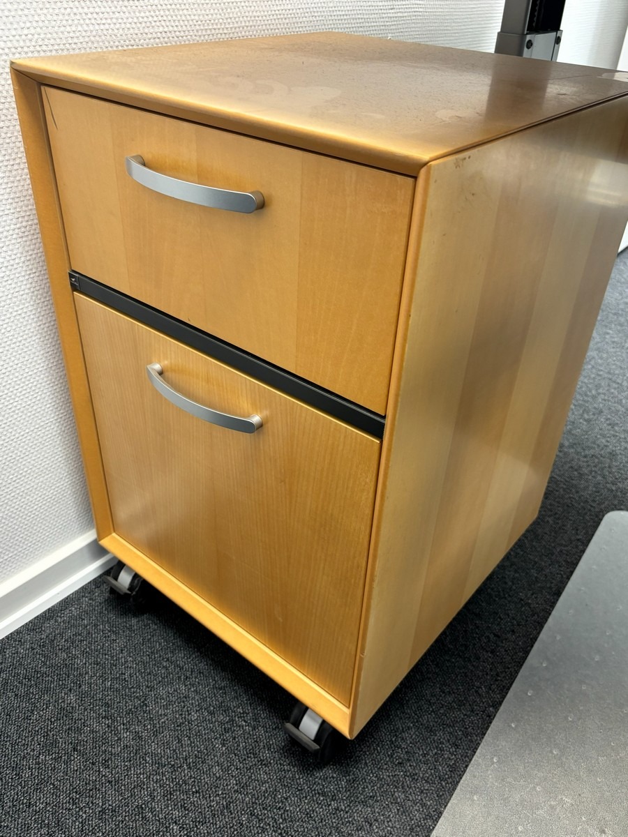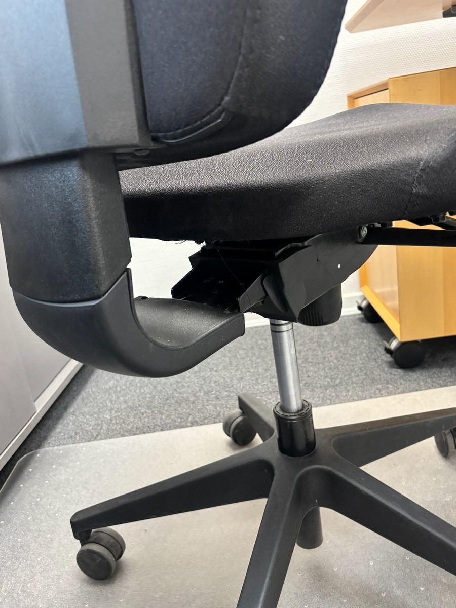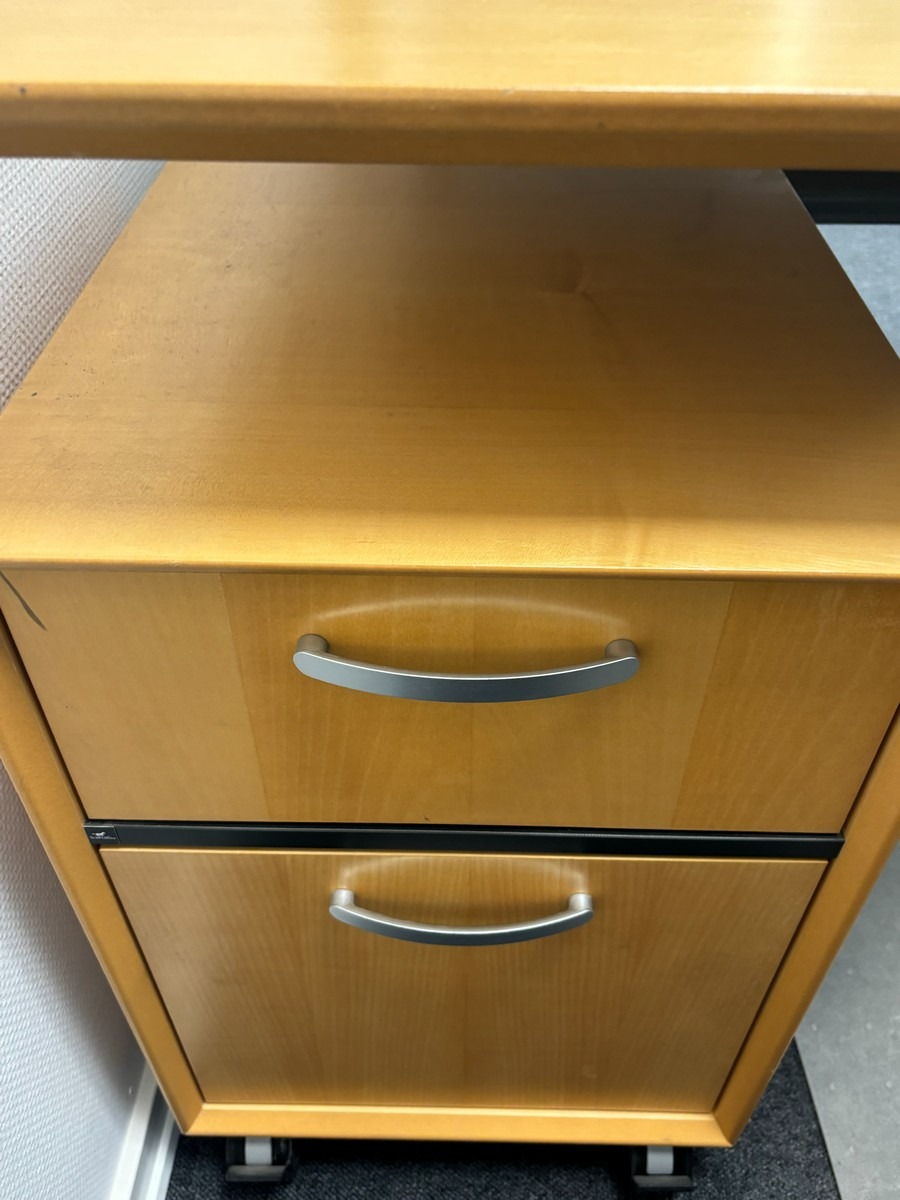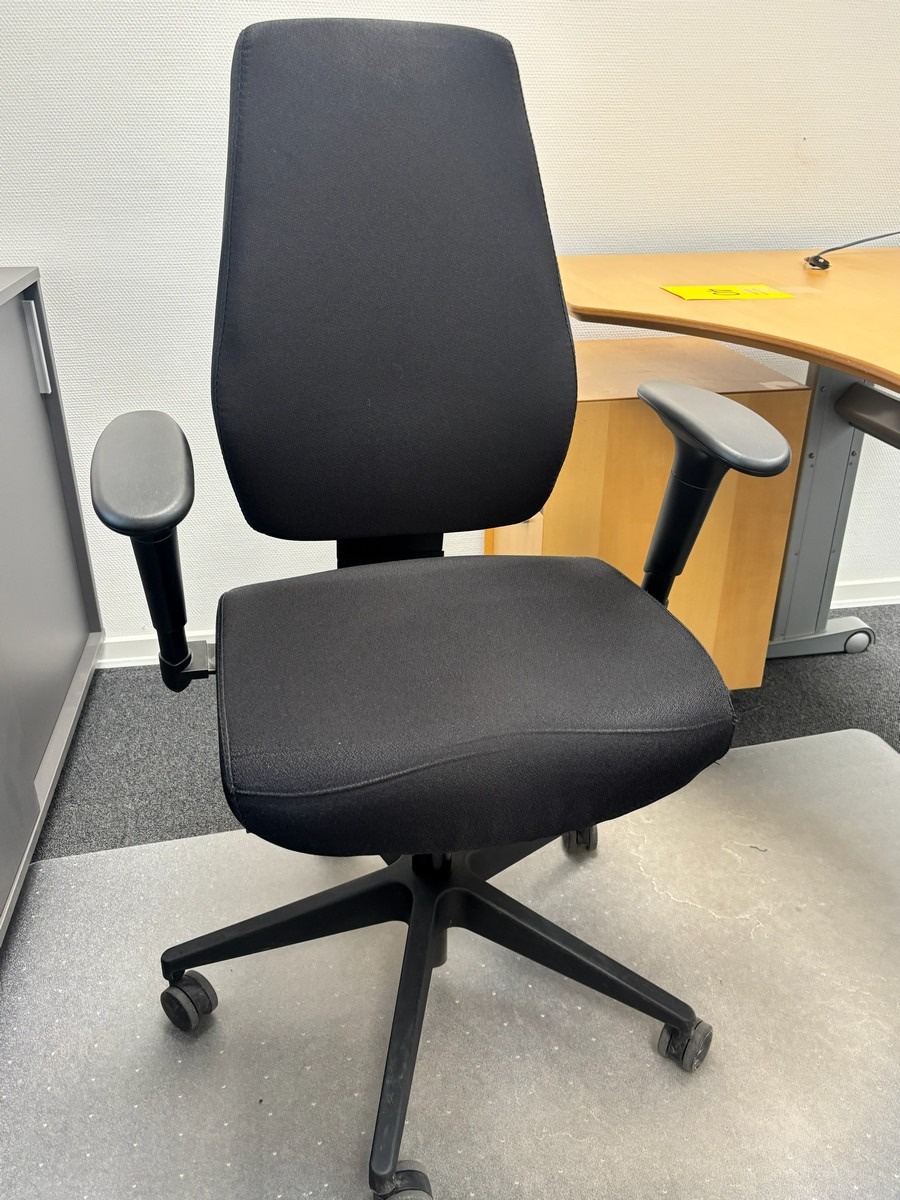 Hæve-/sænkebord med kontorstol, underlag & underskuffe. Oprydning fra virksomhed