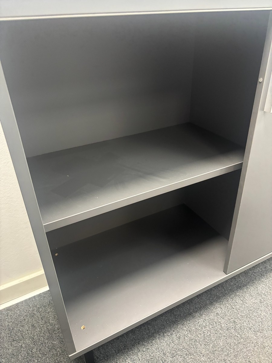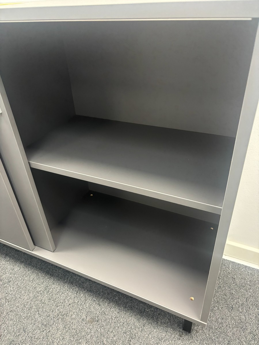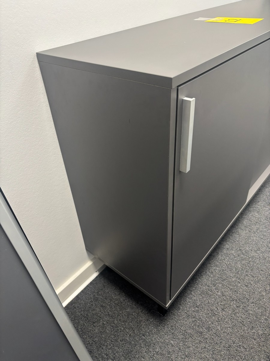 Lav opbevaringsskab i grå – moderne design.120 x 40 x 88 cm.. Oprydning fra virksomhed