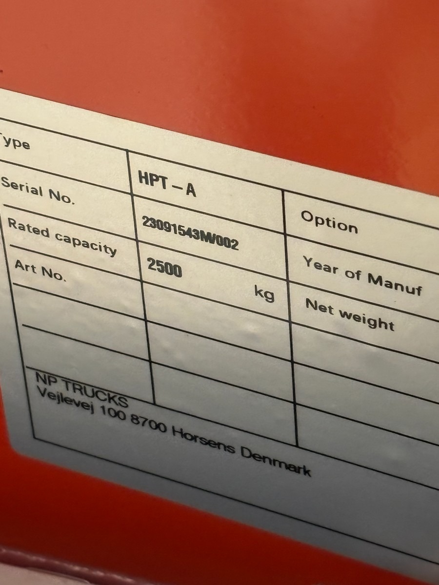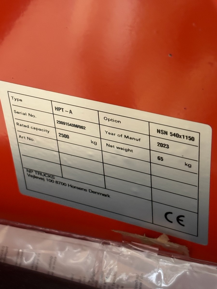 Manuel palleløfter – 2500 kg. Årgang 2023. Fremstår i rigtig pæn stand. Oprydning fra virksomhed