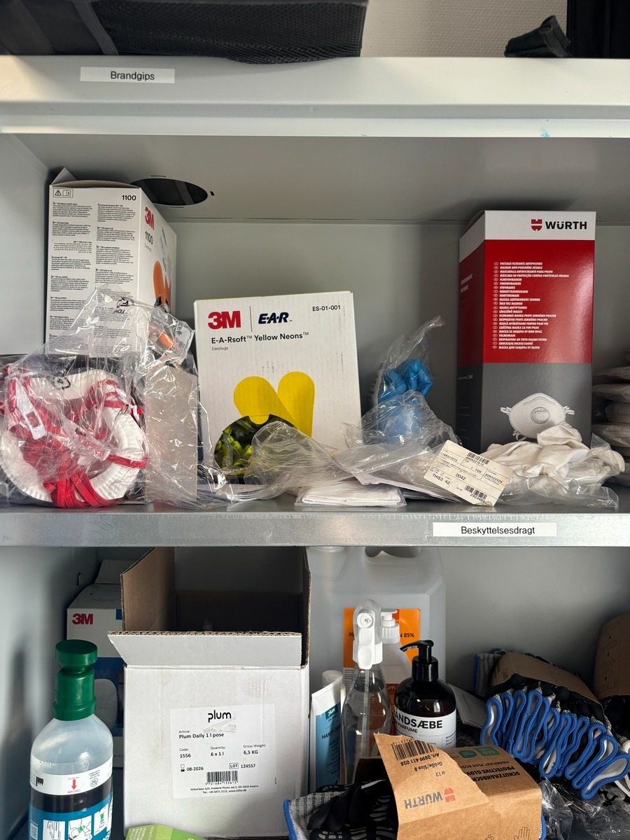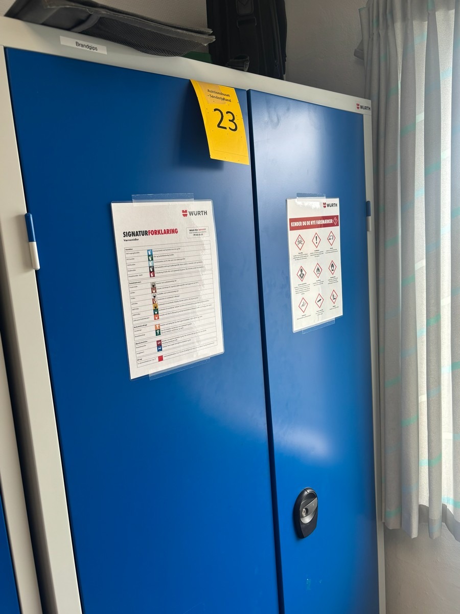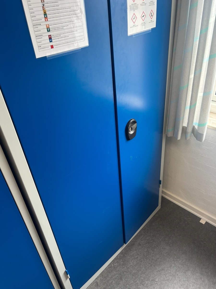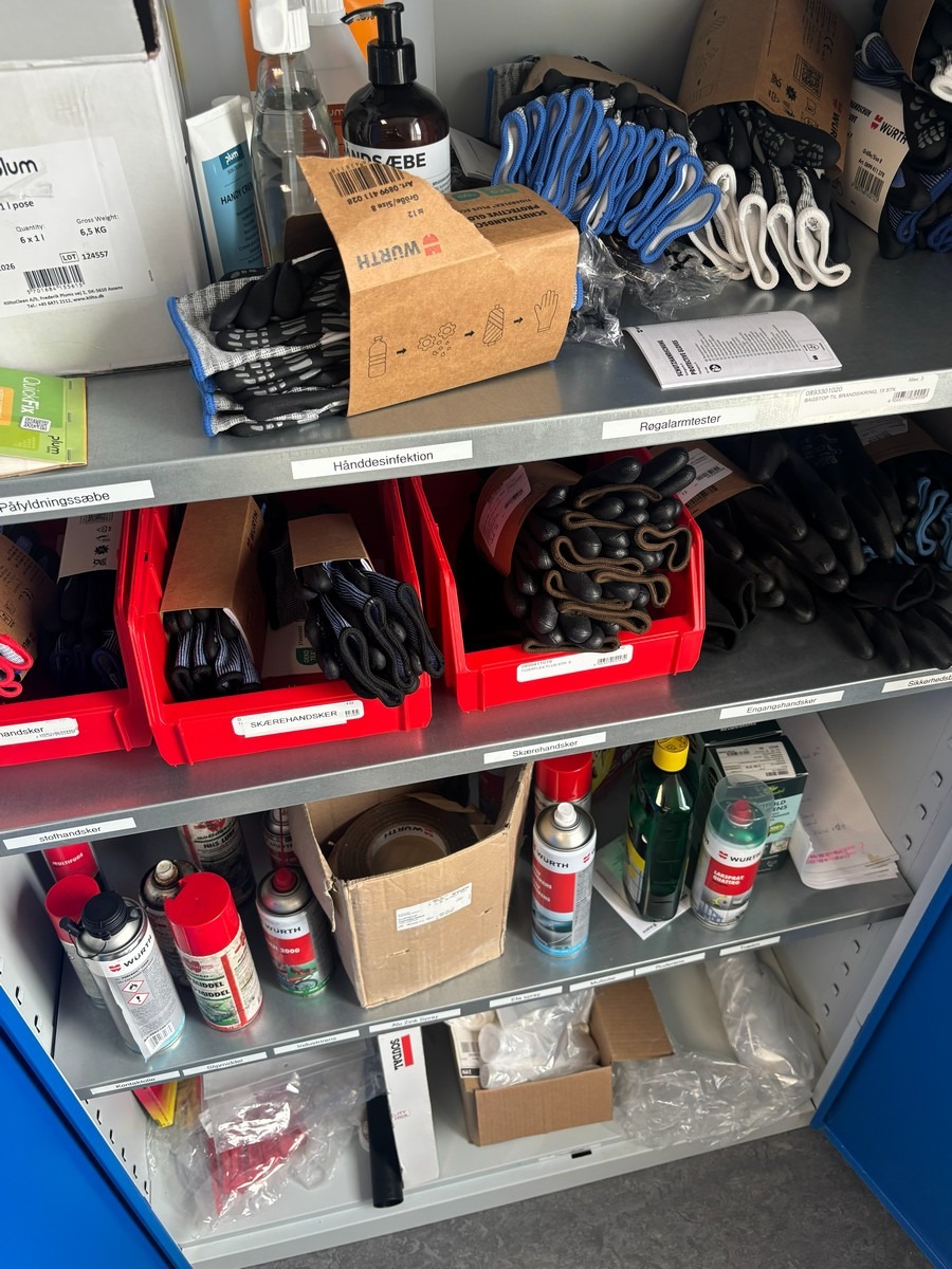 Stålskab / værkstedsskab med hylder (Uden indhold - bliver tømt inden udlevering) Måler: 100 x 200 x 40 cm. Oprydning fra virksomhed