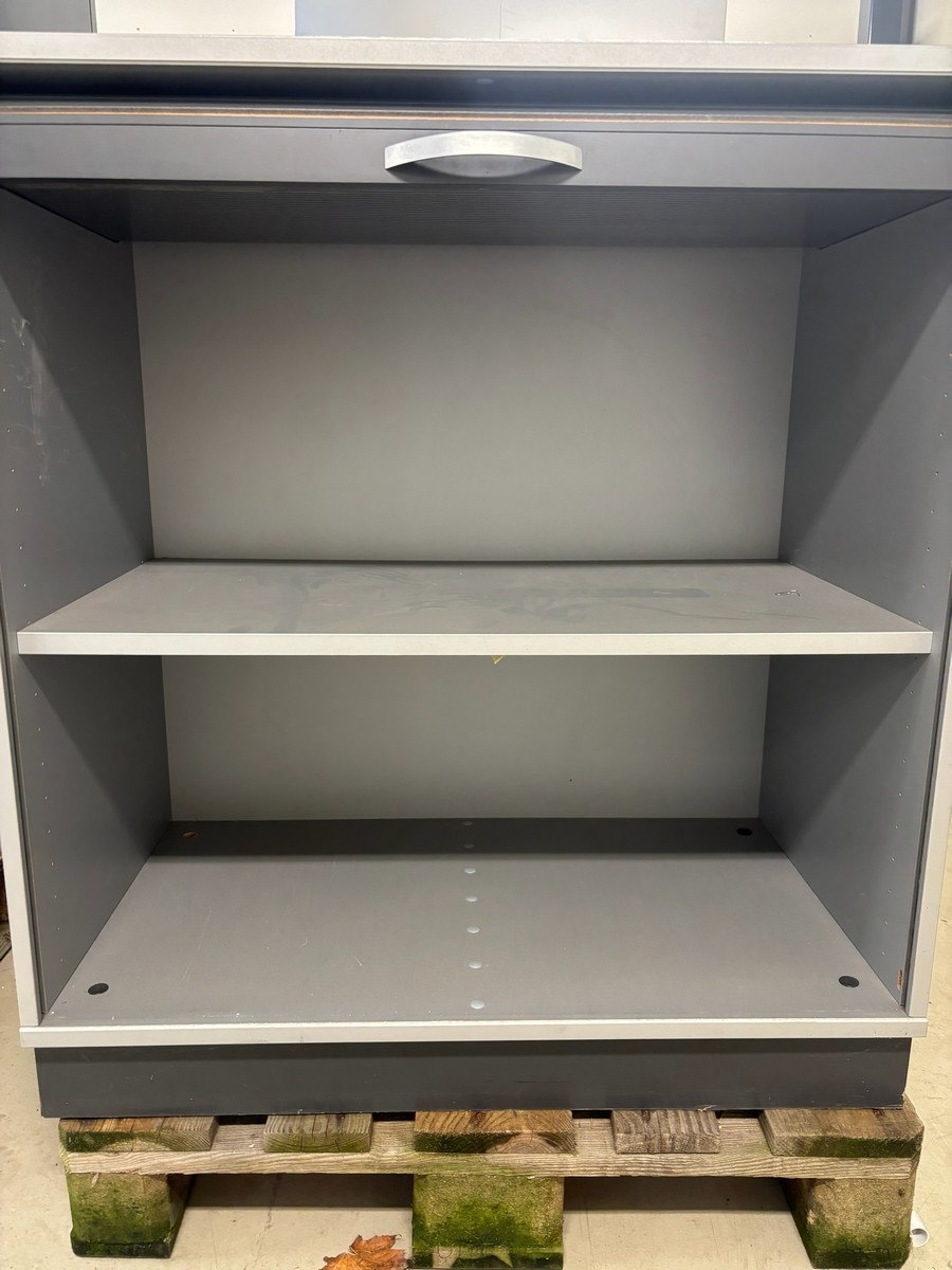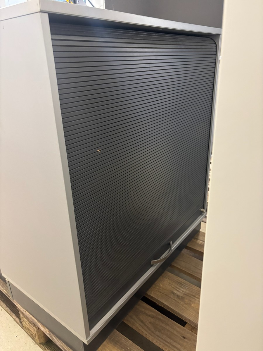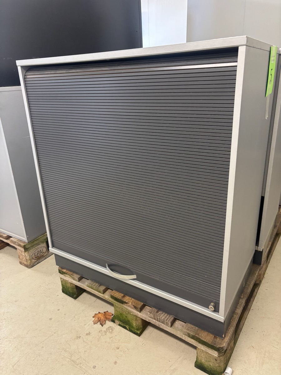2 stk. jalousiskabe i grå – kontorskabe med rullelåge. Måler: 80 x 44 x 90 cm. Brugt med brugsspor. Oprydning fra virksomhed
