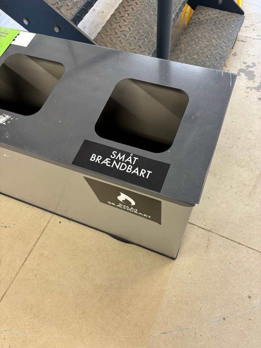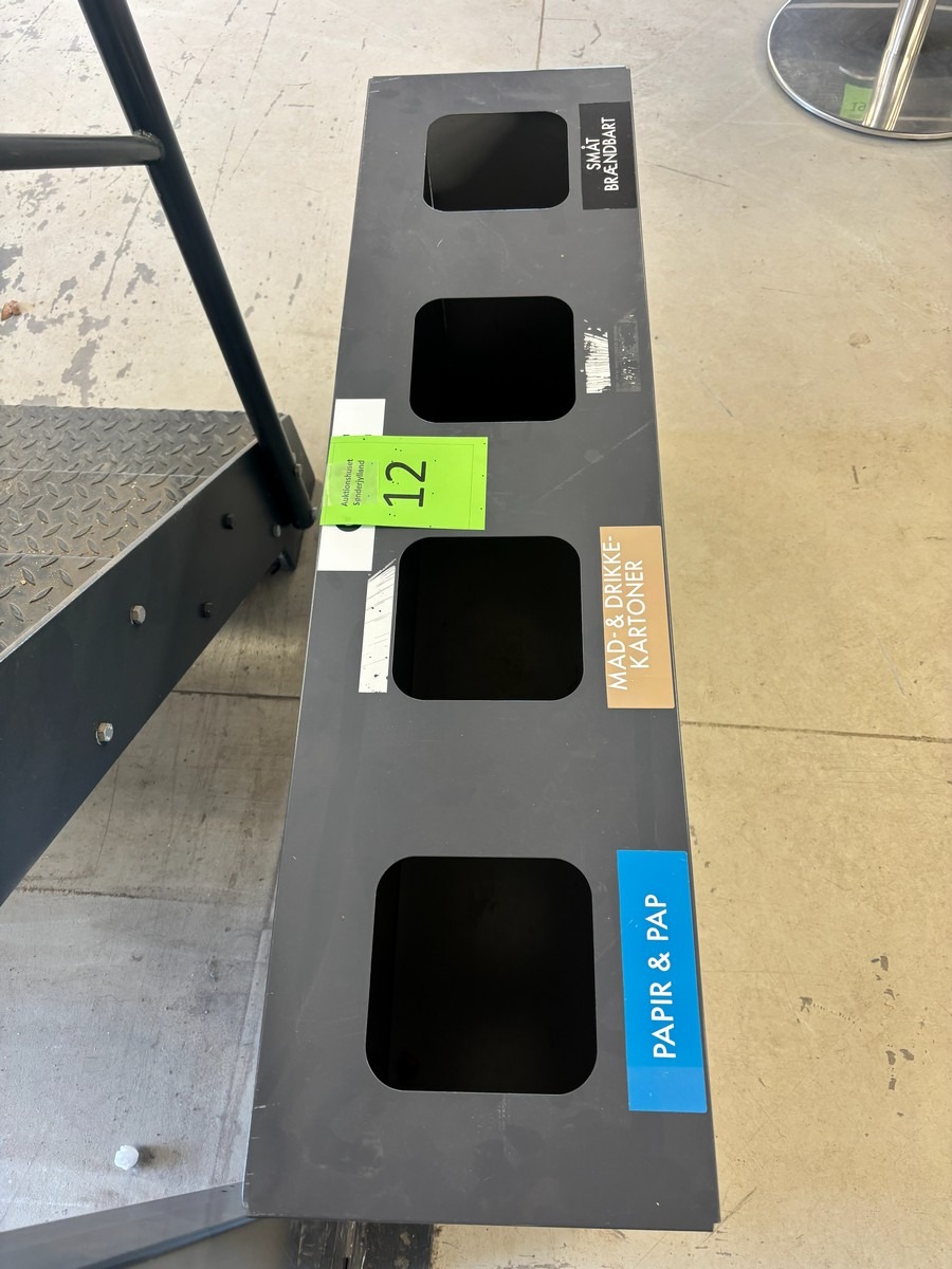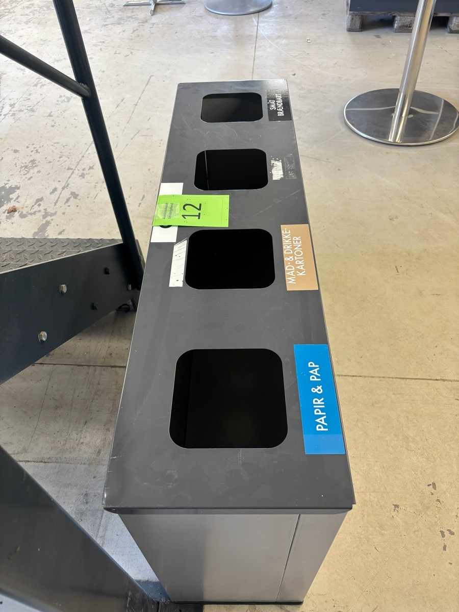 Affaldssorteringsstation med 4 fraktioner. Måler: 120 x 31 x 70 cm . Brugt med brugsspor. Oprydning fra virksomhed