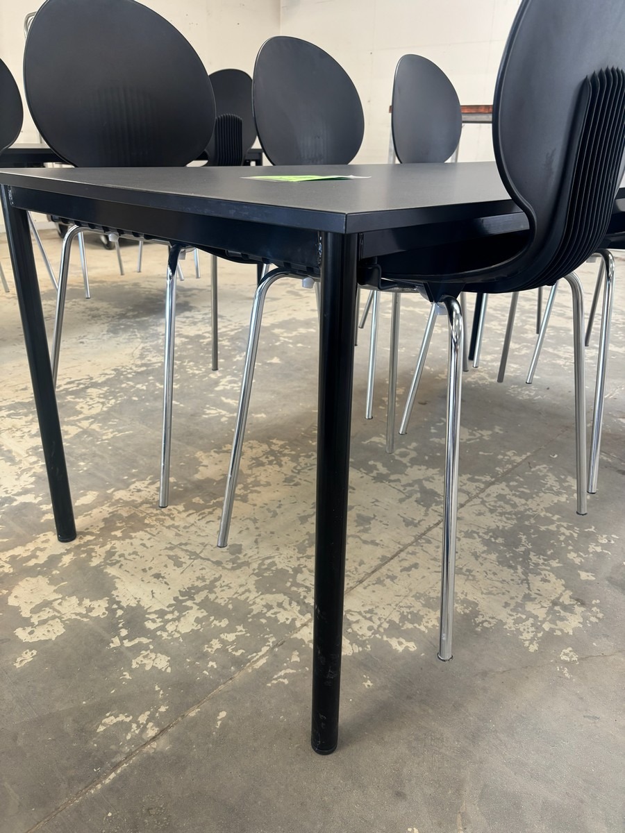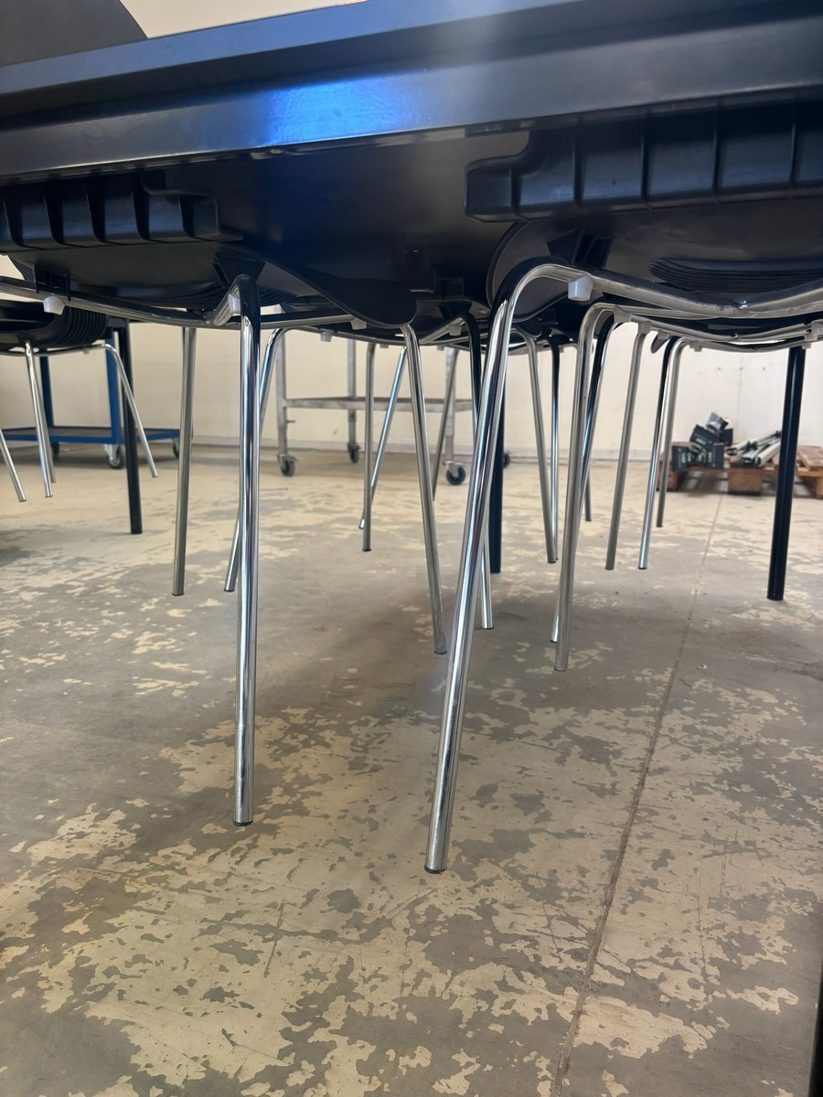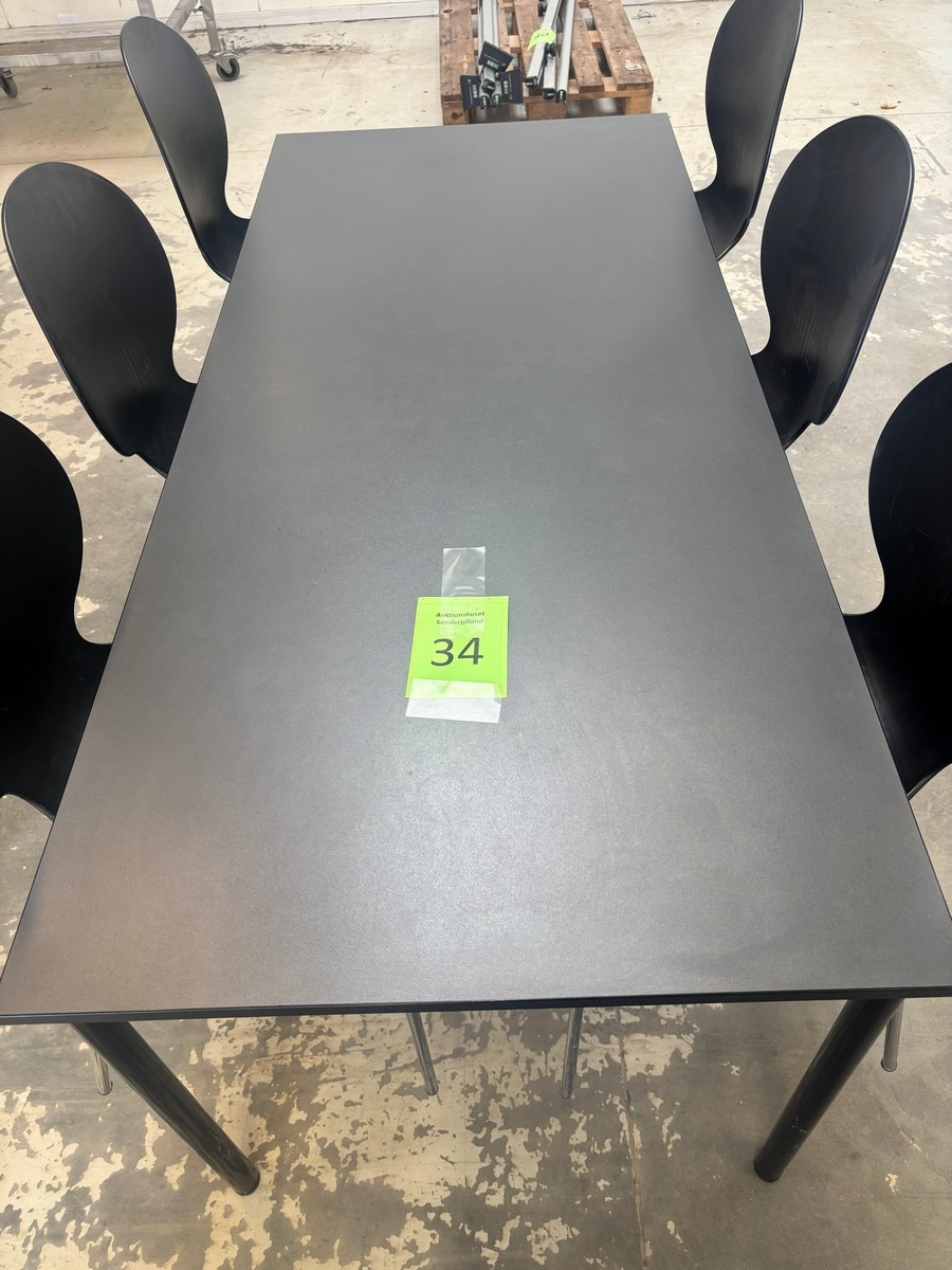 Konferencebord 180x80 cm med 6 Galvano tecnica kantinestole. Brugt med brugsspor. Oprydning fra virksomhed