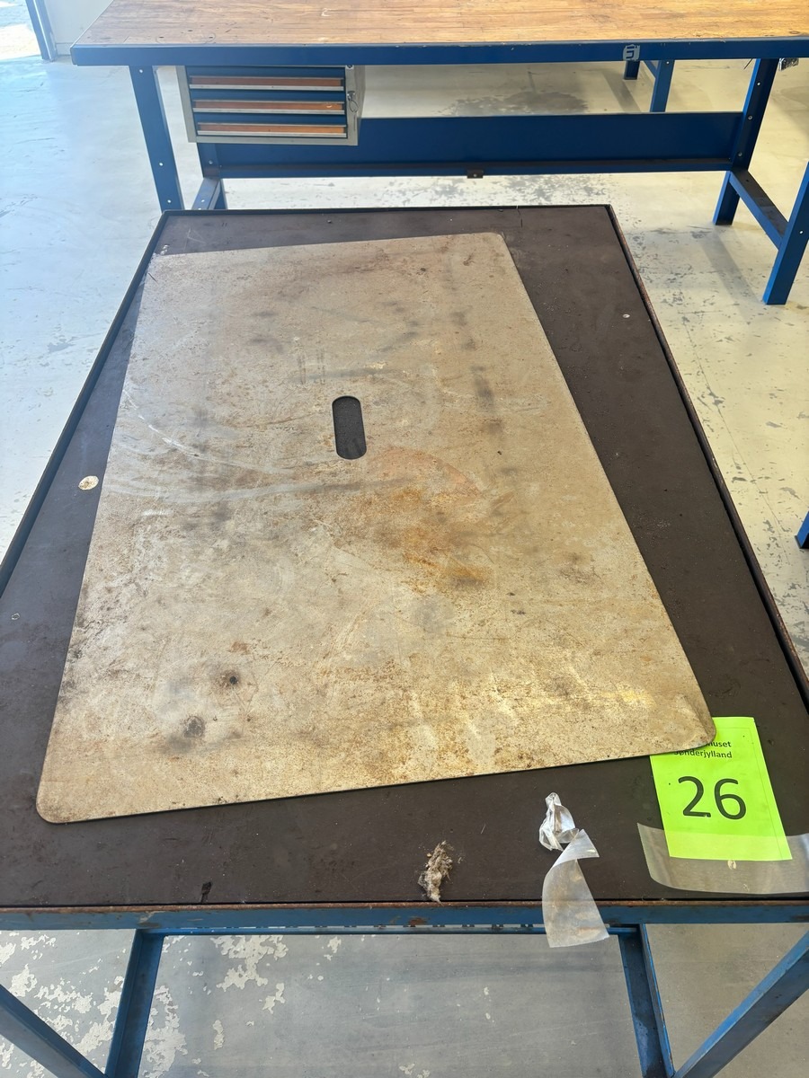 Kraftigt arbejdsbord / værkstedsbord. Måler: 130 x 85 x 90 cm. Brugt med brugsspor. Oprydning fra virksomhed