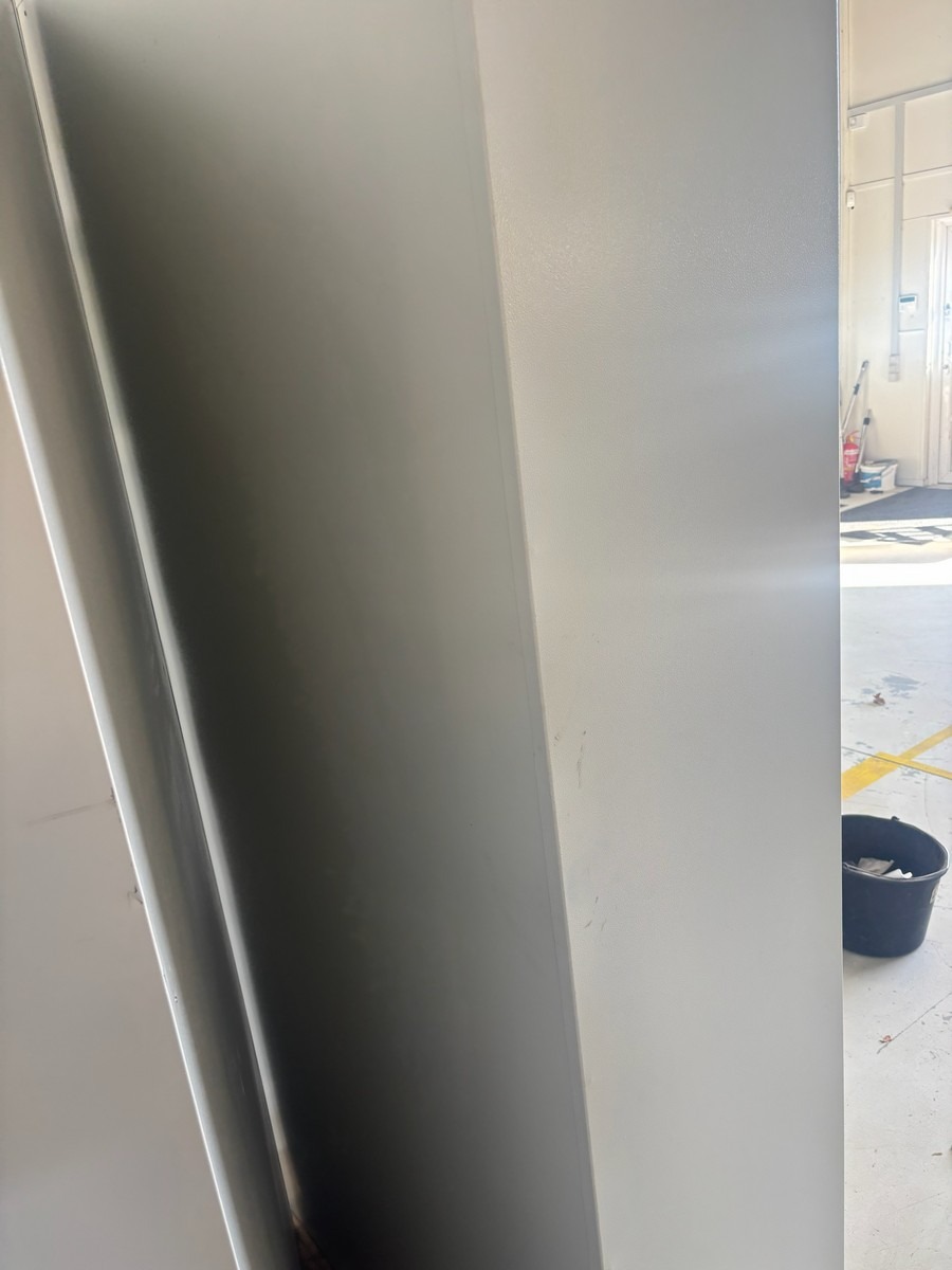 Kraftigt stålskab i lysegrå med dobbeltlåger. Måler: 200 x 40 x 90cm . Brugt med brugsspor. Oprydning fra virksomhed