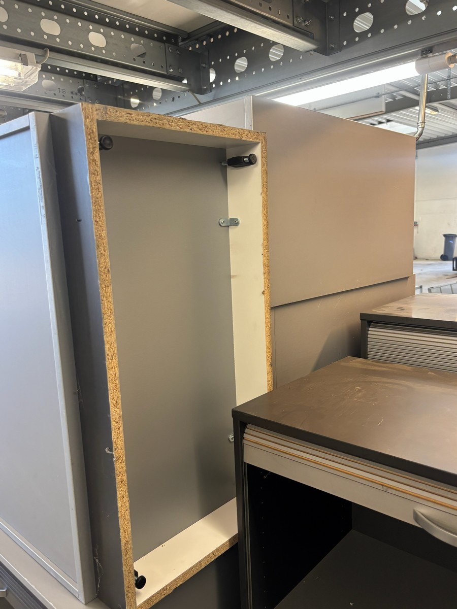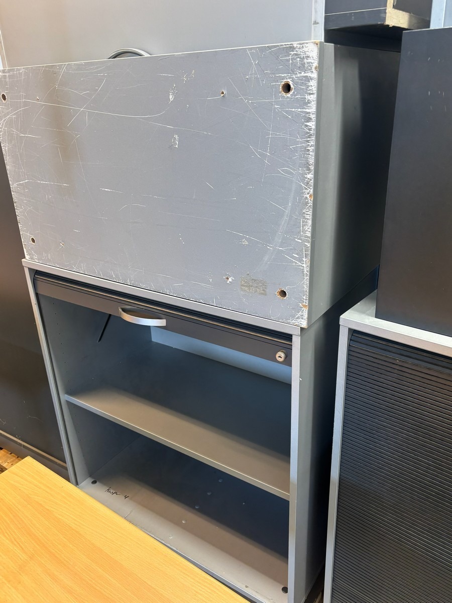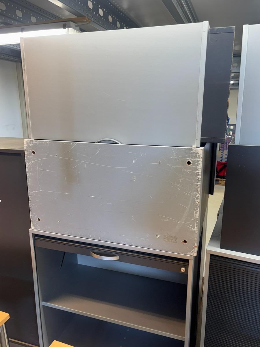 Lille parti kontormøbler – jalousiskab, overskab m.m.. Brugt med brugsspor. Oprydning fra virksomhed