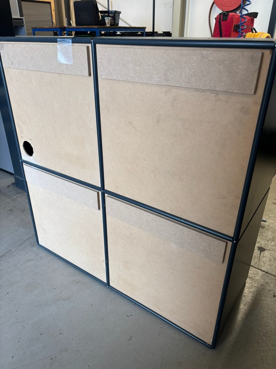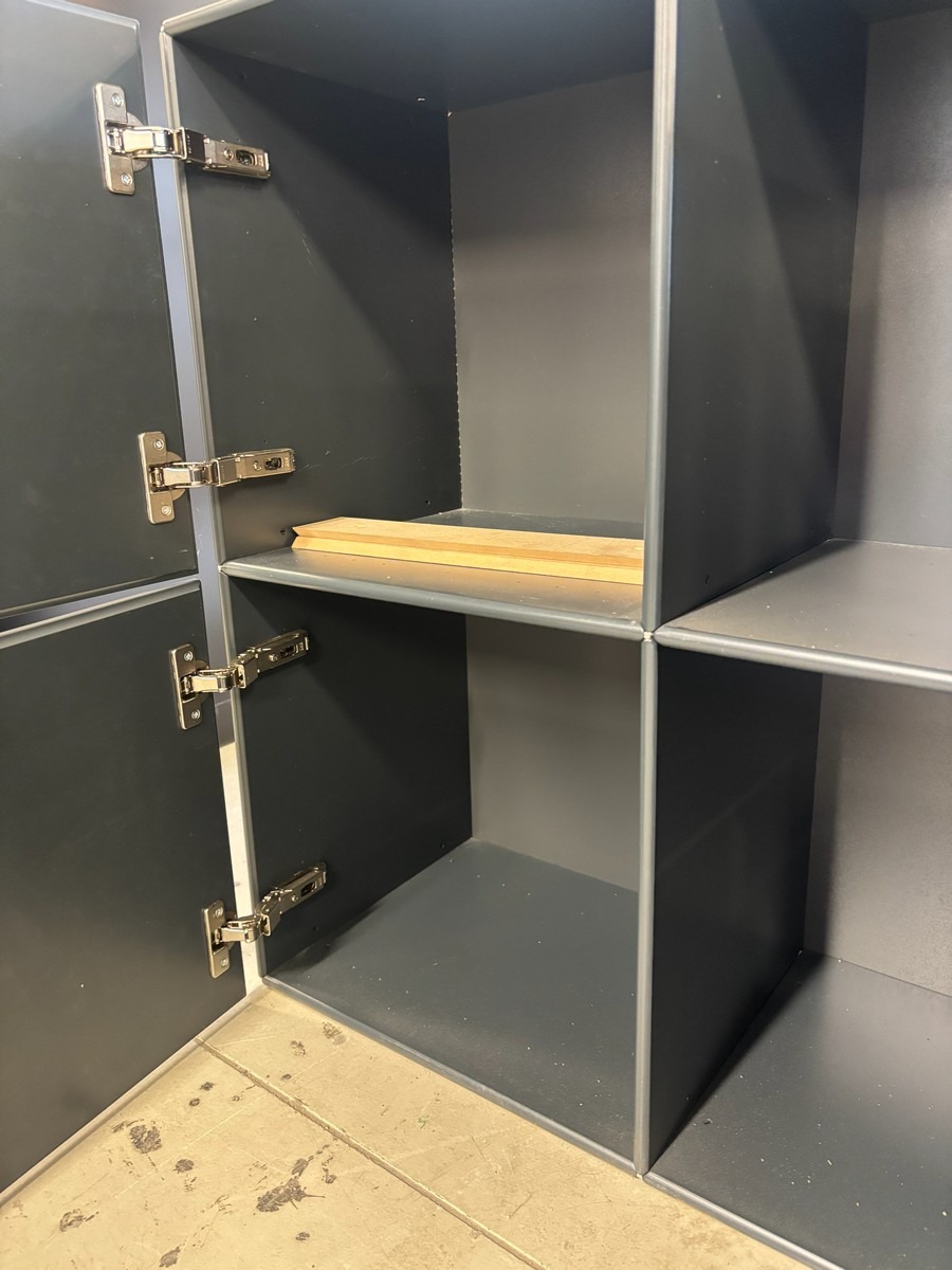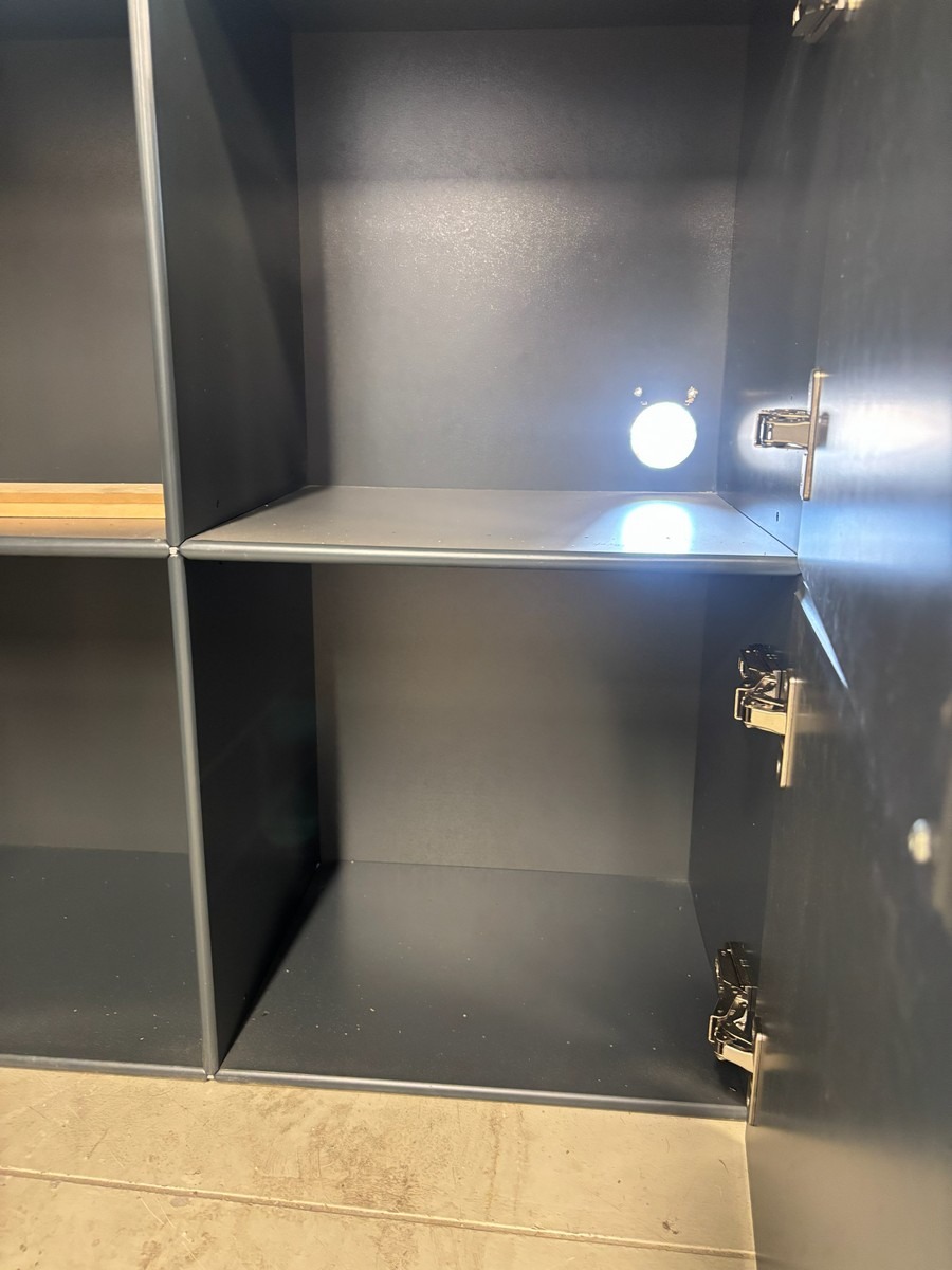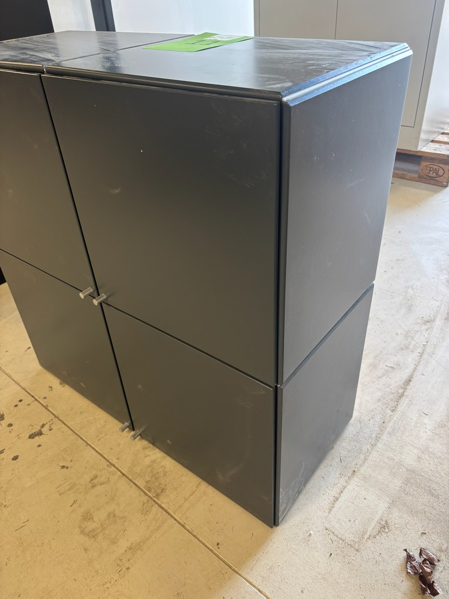 Modulopbygget opbevaringsskab – 4 rum – sort/antracit. Måler: 77 x 33 x 77 cm. Brugt med brugsspor. Oprydning fra virksomhed