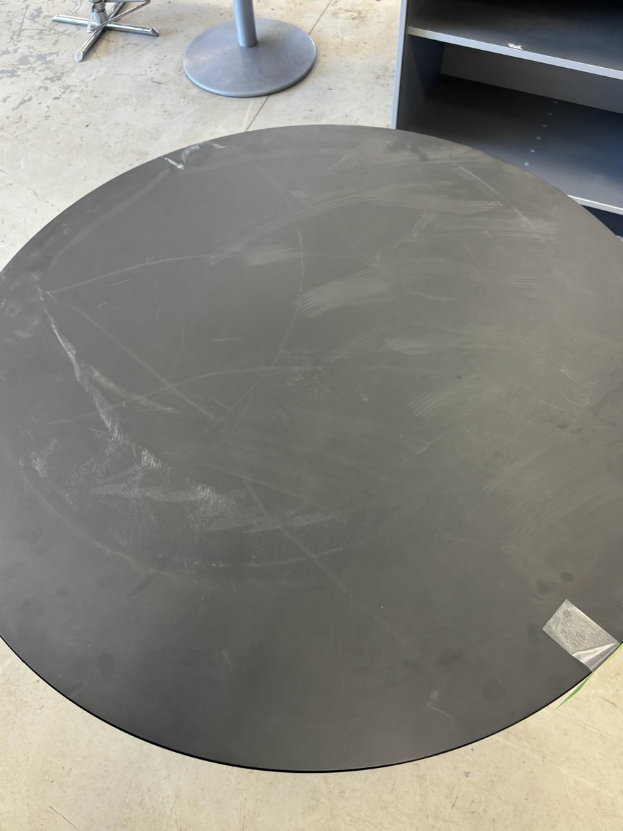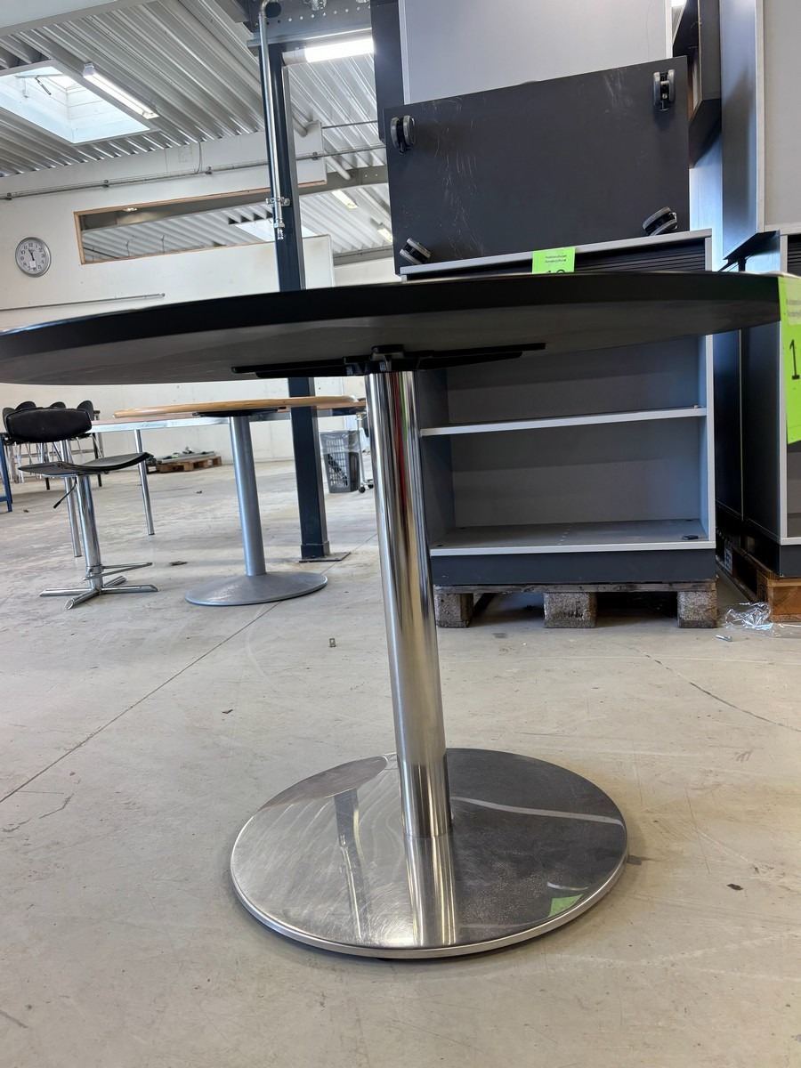 Rundt mødebord / cafebord – sort bordplade – krom søjlefod. Ø 110, H: 76 cm  . Brugt med brugsspor. Oprydning fra virksomhed