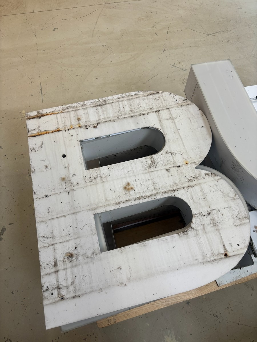 Store reklamebogstaver / facadeskilte – C, B, R og E med LED. Fungerede ved nedtagning. Brugt med brugsspor. Oprydning fra virksomhed