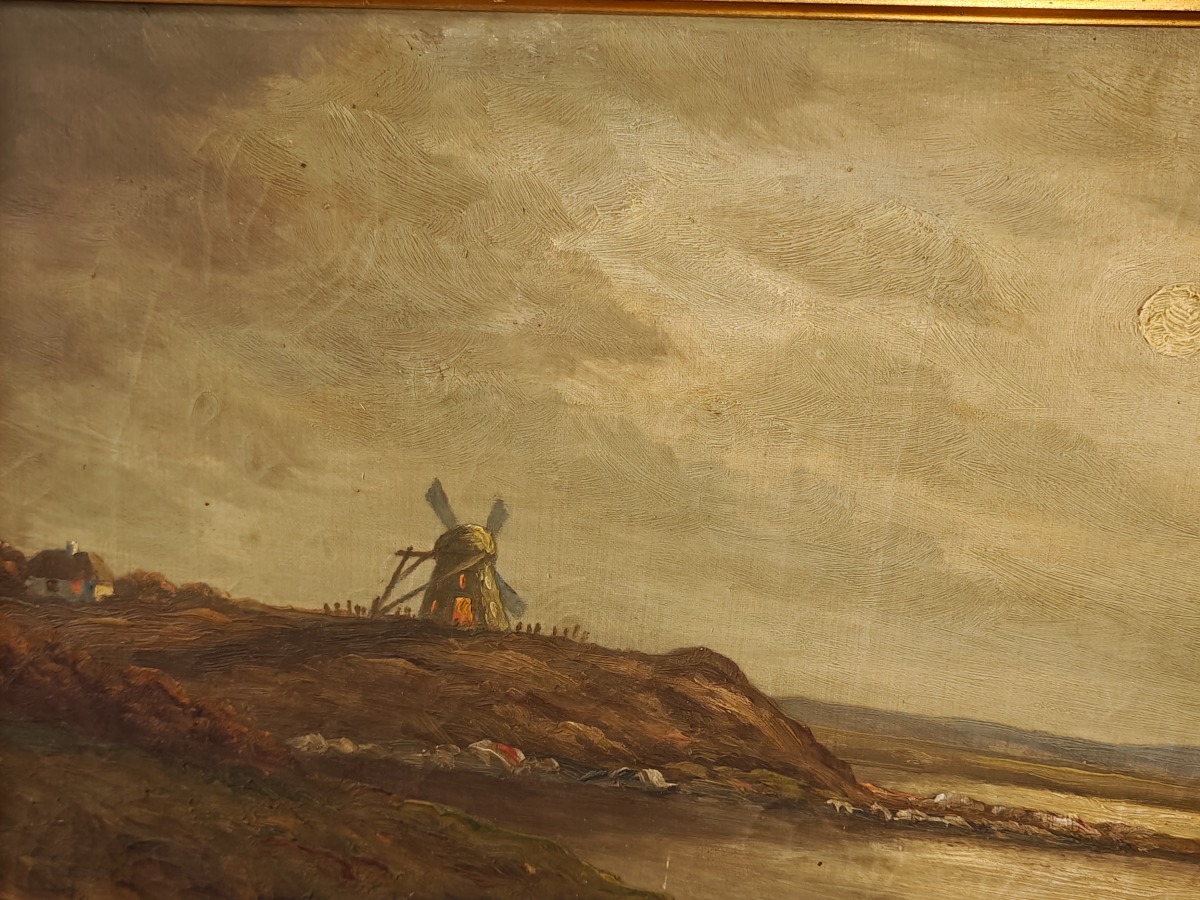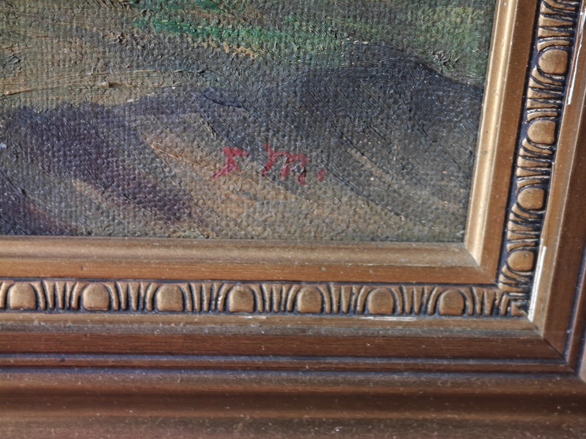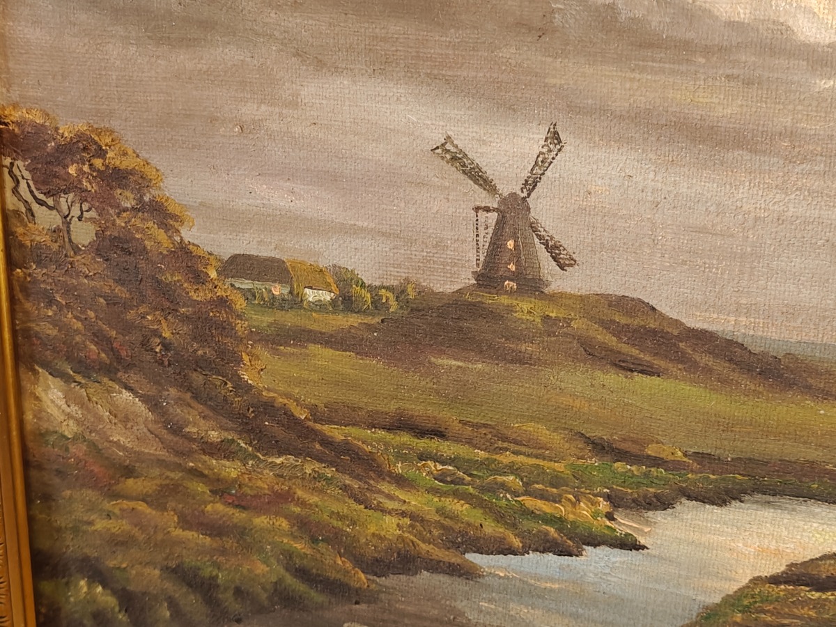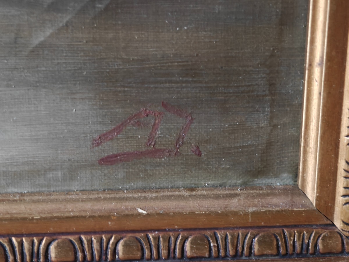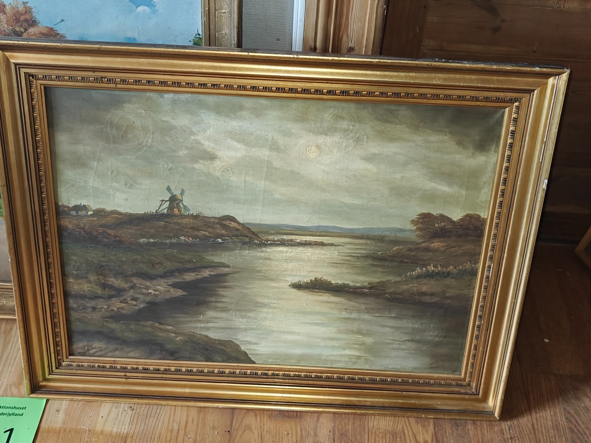 2 Malerier i guldfarvede rammer. Heraf 1 af kunstneren AJ.
