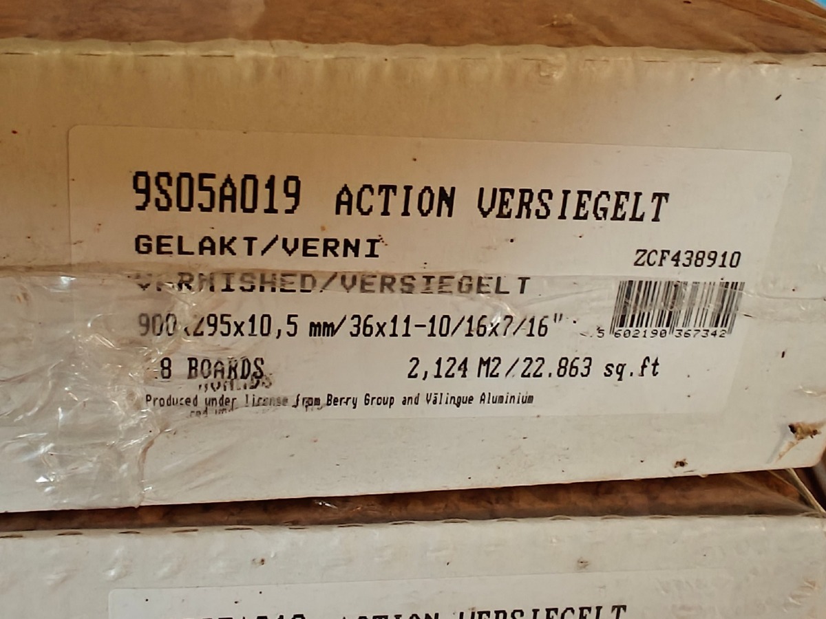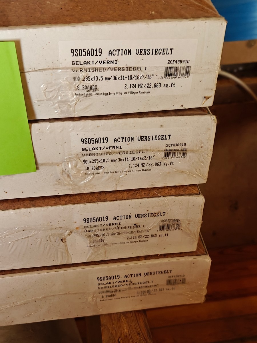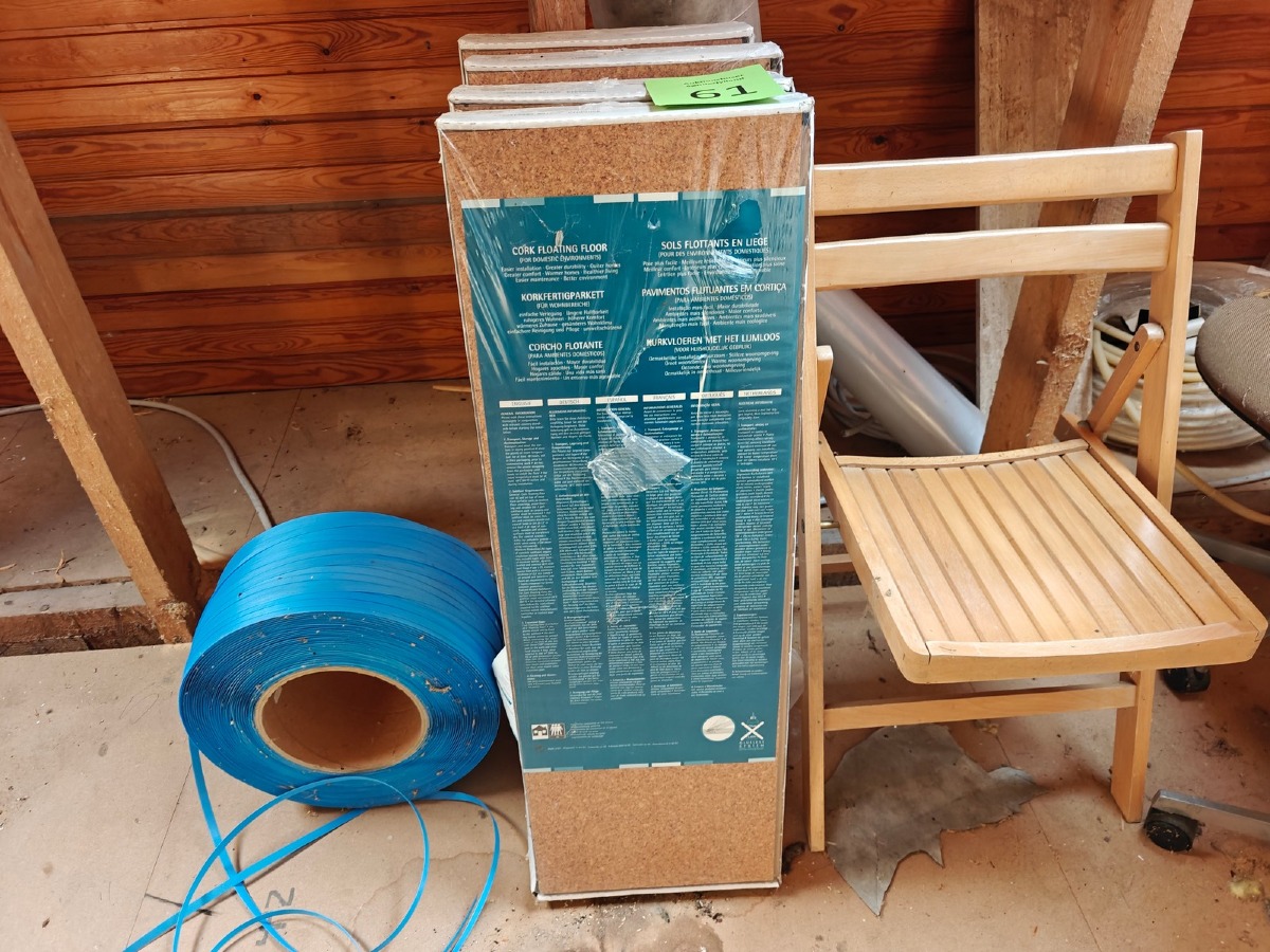 Korkbehandlet parketgulv: 4 Pk á 2.12 m2. Ubrugt. 1 Rl strapbånd, flet reol og klapstol medfølger. Øvrige effekter på fotos medfølger ikke. Står på loft.