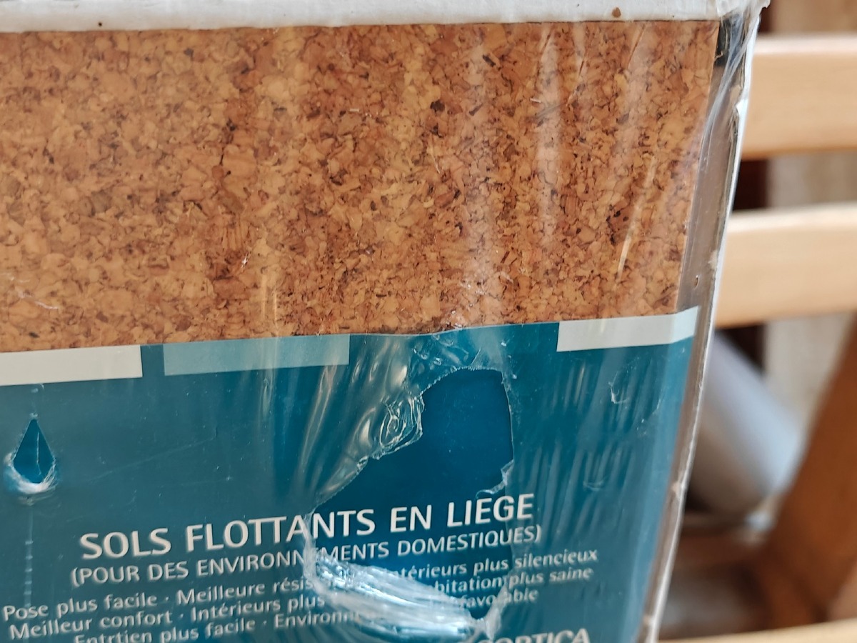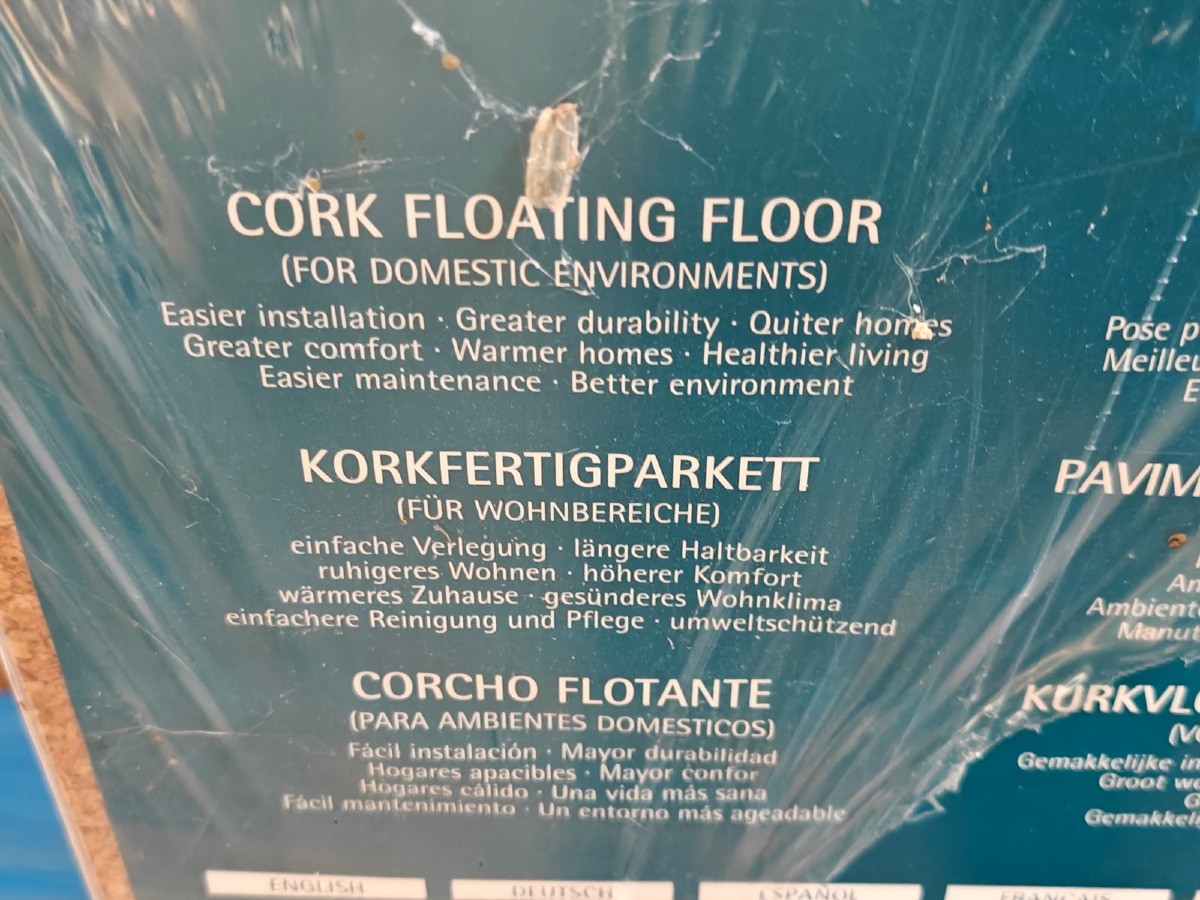 Korkbehandlet parketgulv: 4 Pk á 2.12 m2. Ubrugt. 1 Rl strapbånd, flet reol og klapstol medfølger.