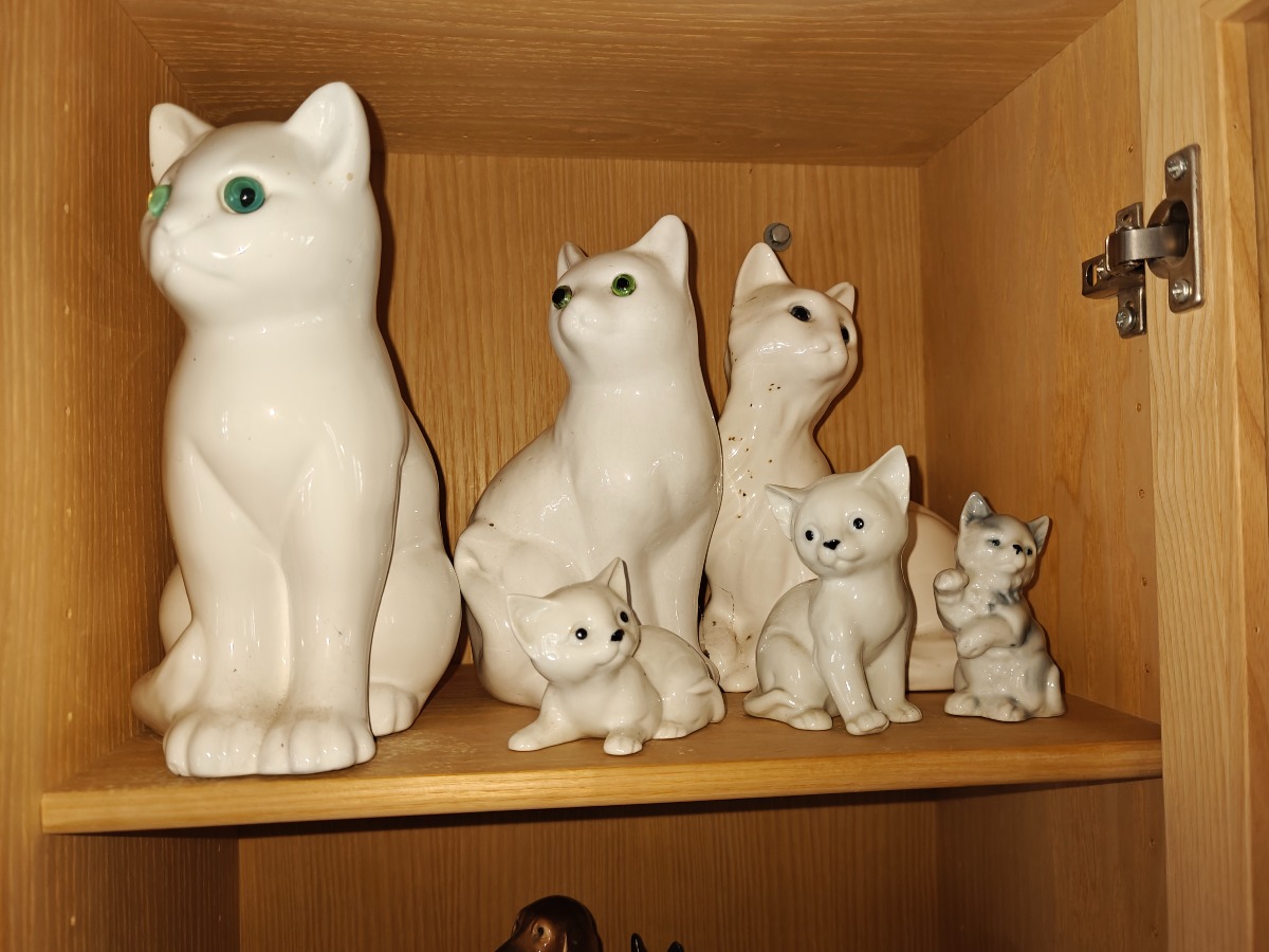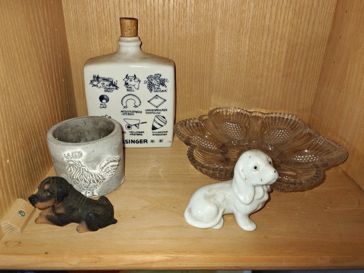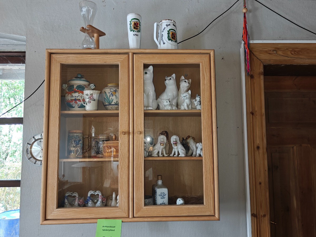 Skab m/indhold. Div figurer bl.a 2 'krymmel'hunde mm. Selvnedtagning.