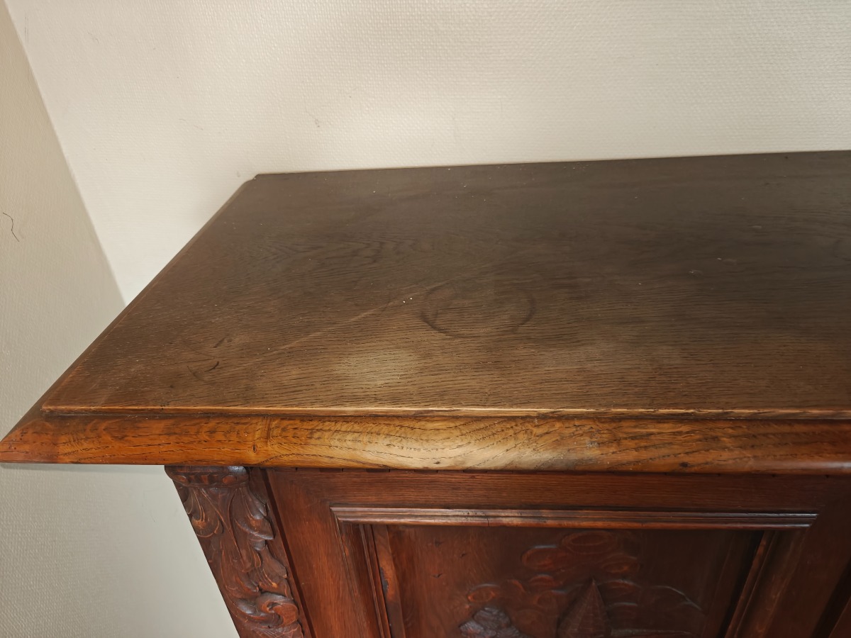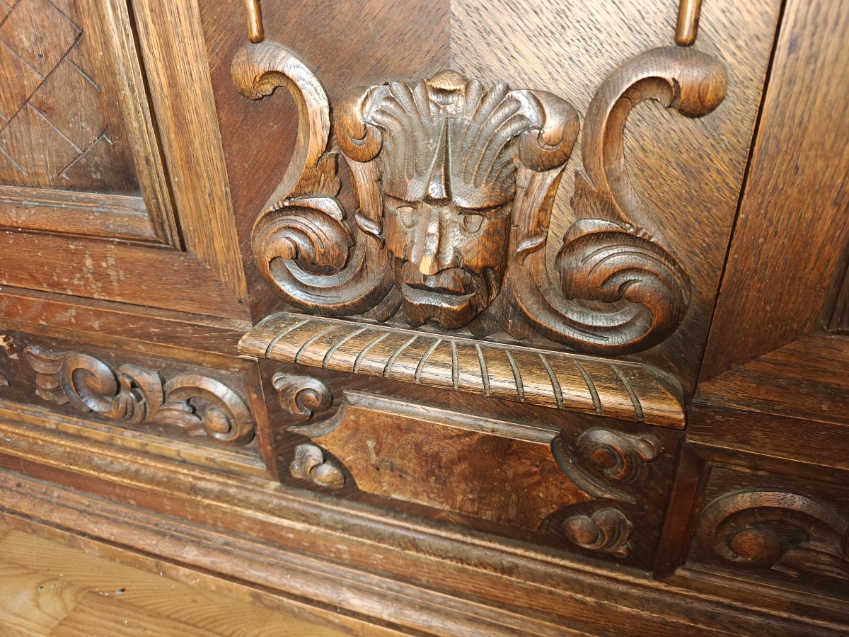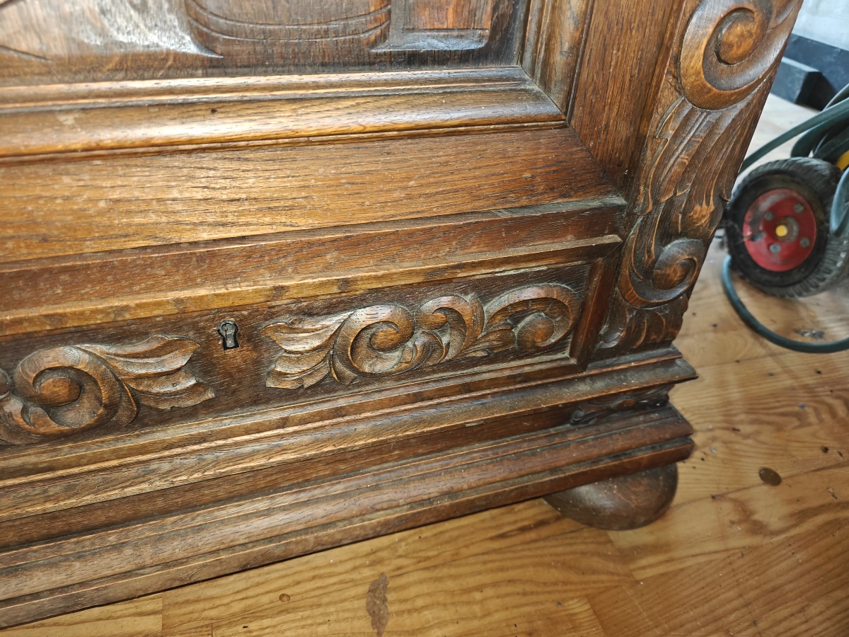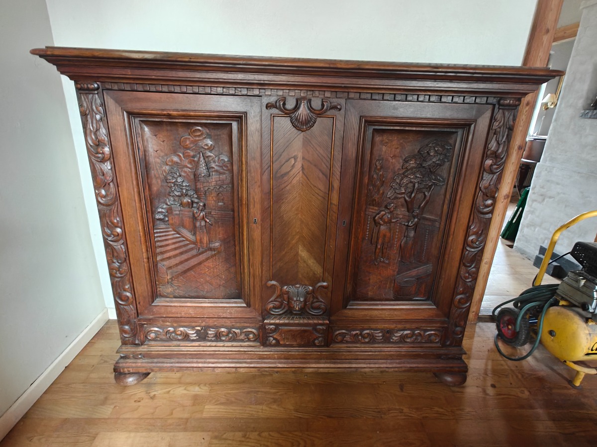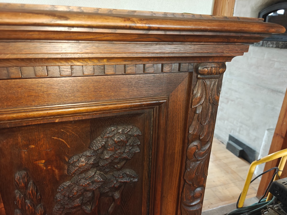 Skab m/udskæringer. Mål: 150 x 60 x 130 cm. Effekter på skab medfølger ikke.