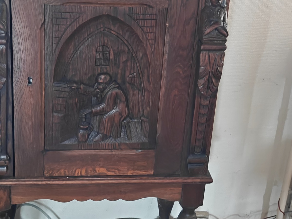 Skab m/udskæringer. Mål: H: 105 cm. B: 60 cm. D: 35 cm. Effekter på skab medfølger ikke.
