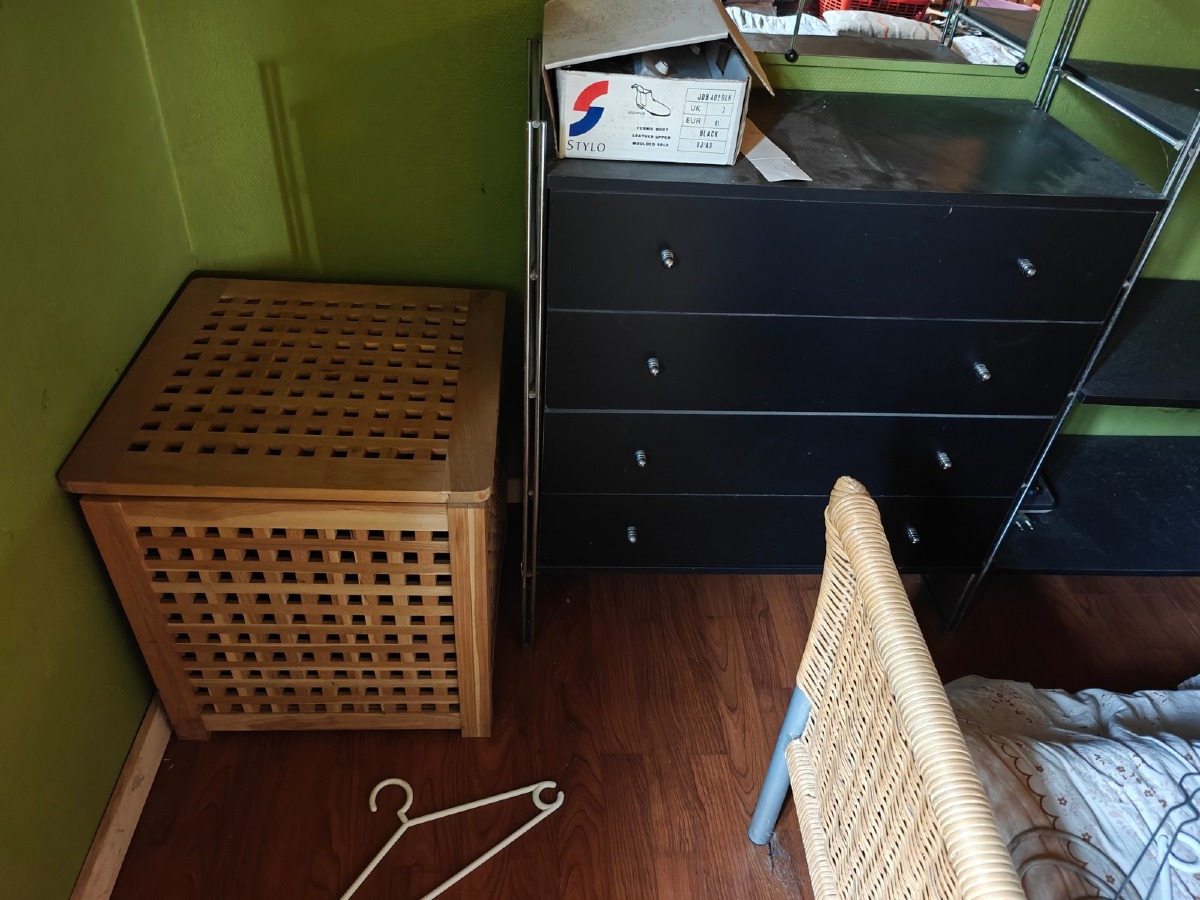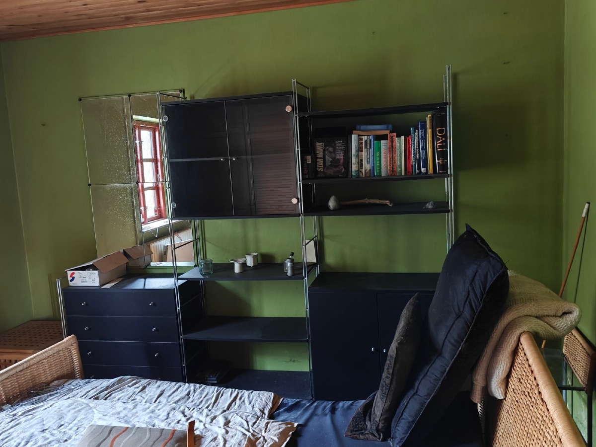 Tøm rummet. Senge, reoler, tæppe mm. Indhold på reoler og seng medfølger. Lampe medfølger ikke. Står i stueplan.