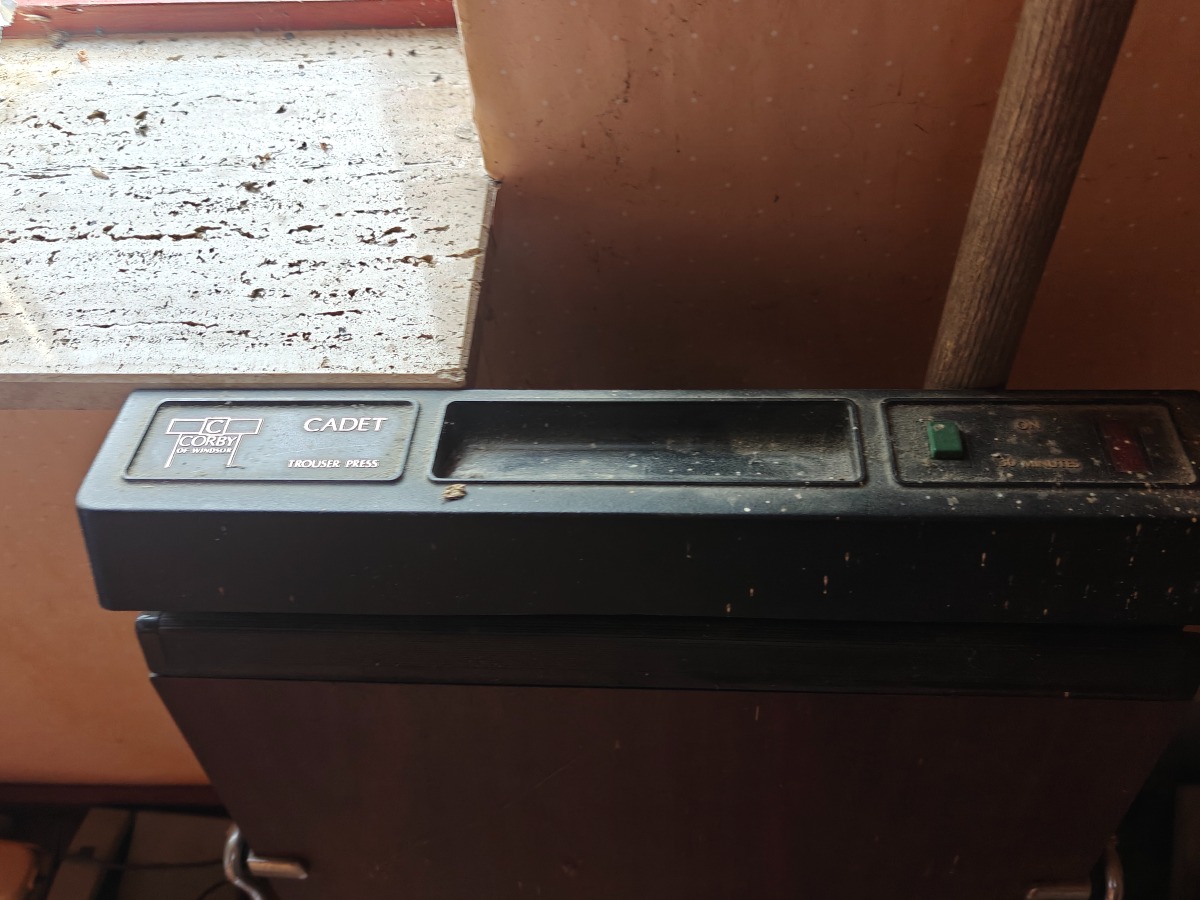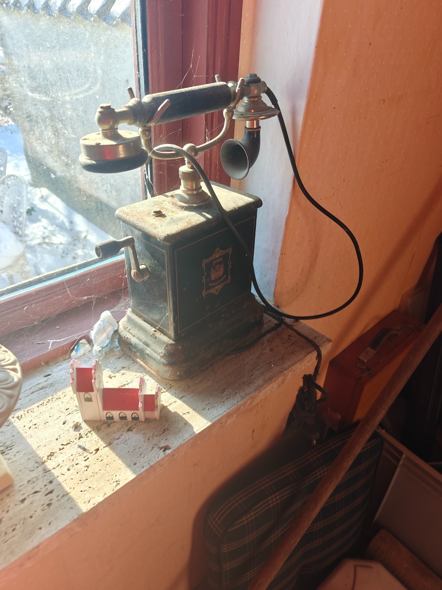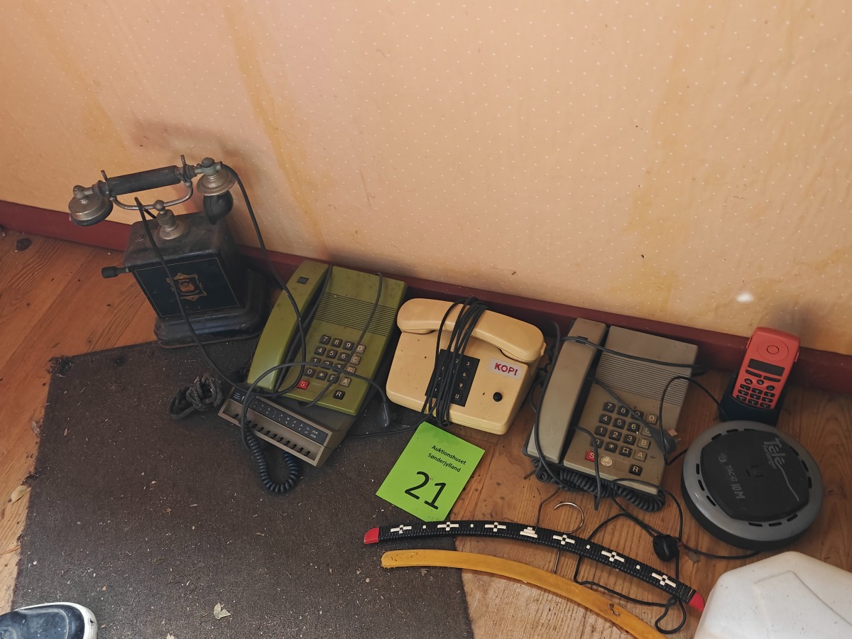 Tøm rummet. Tæppe, retro telefoner og tøjpresse. (Entre/indgang).