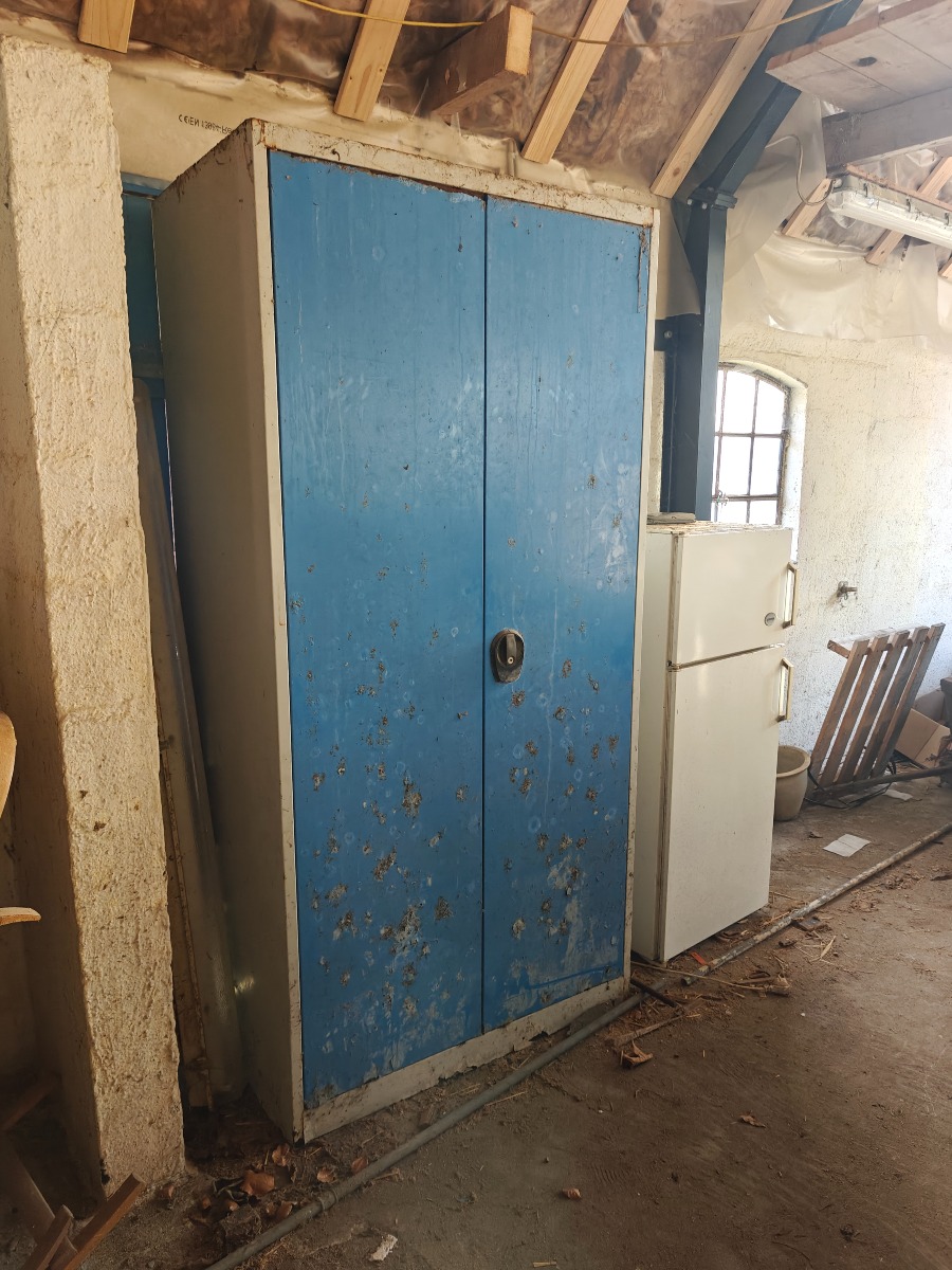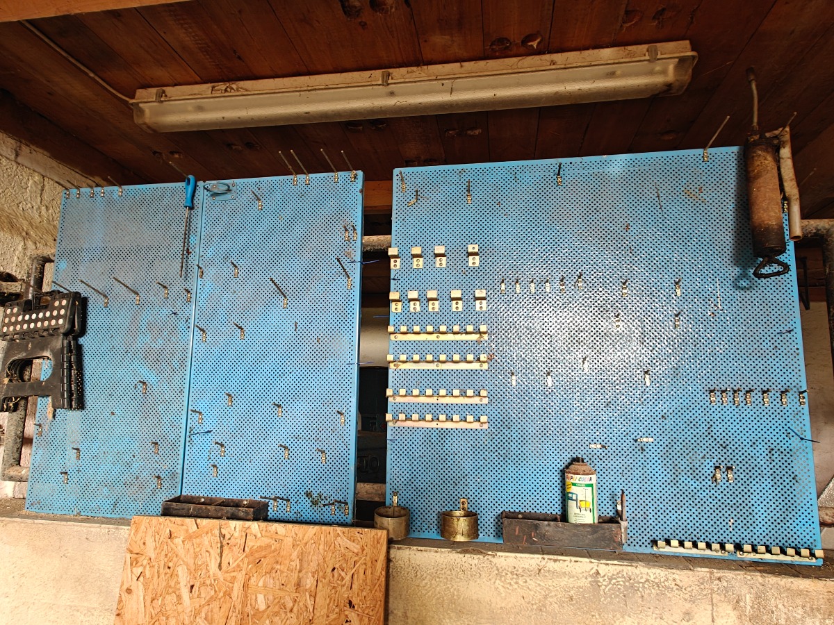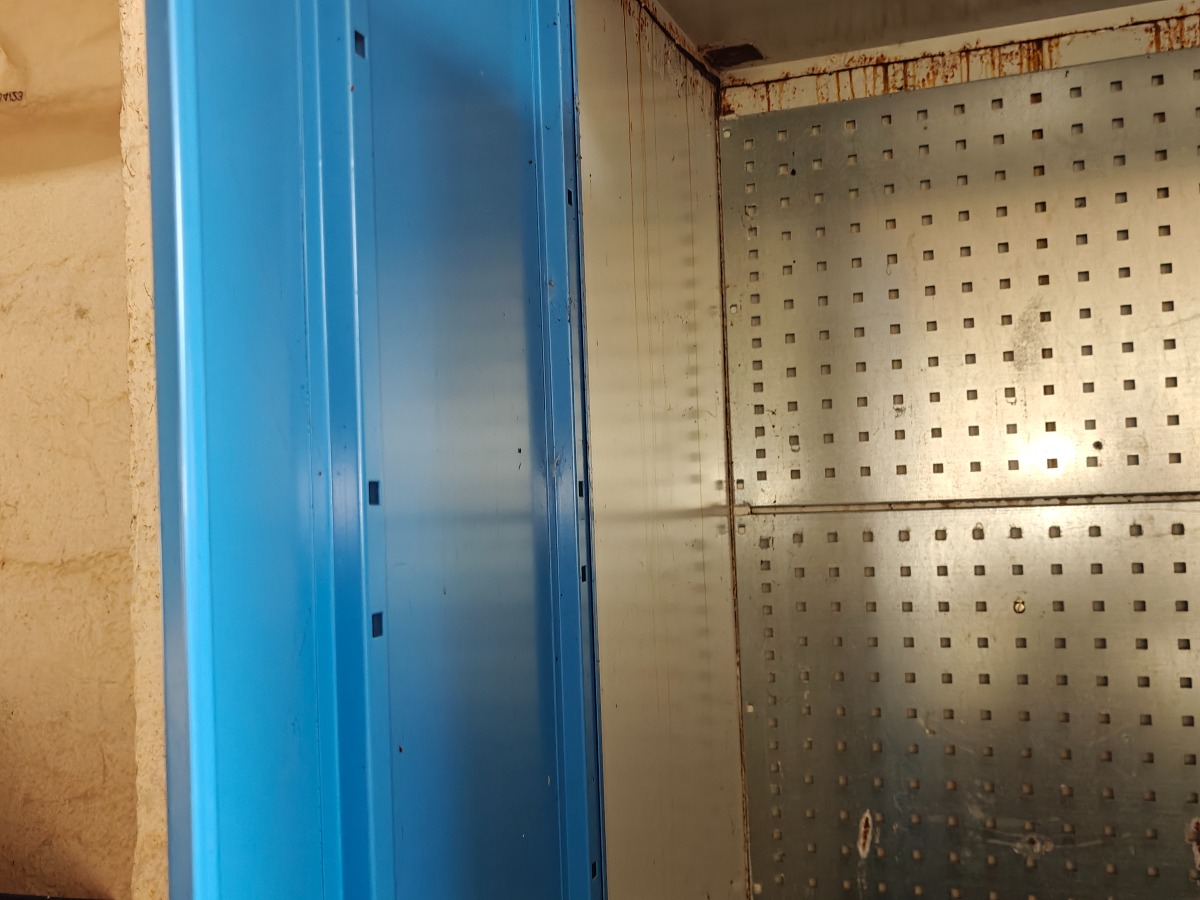 Stålskab & 4 værktøjstavler. Indhold i skab og på tavler medfølger (bl.a 2 fedtsprøjter). Selvnedtagning.