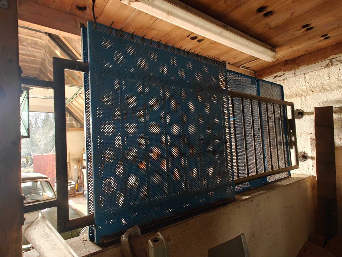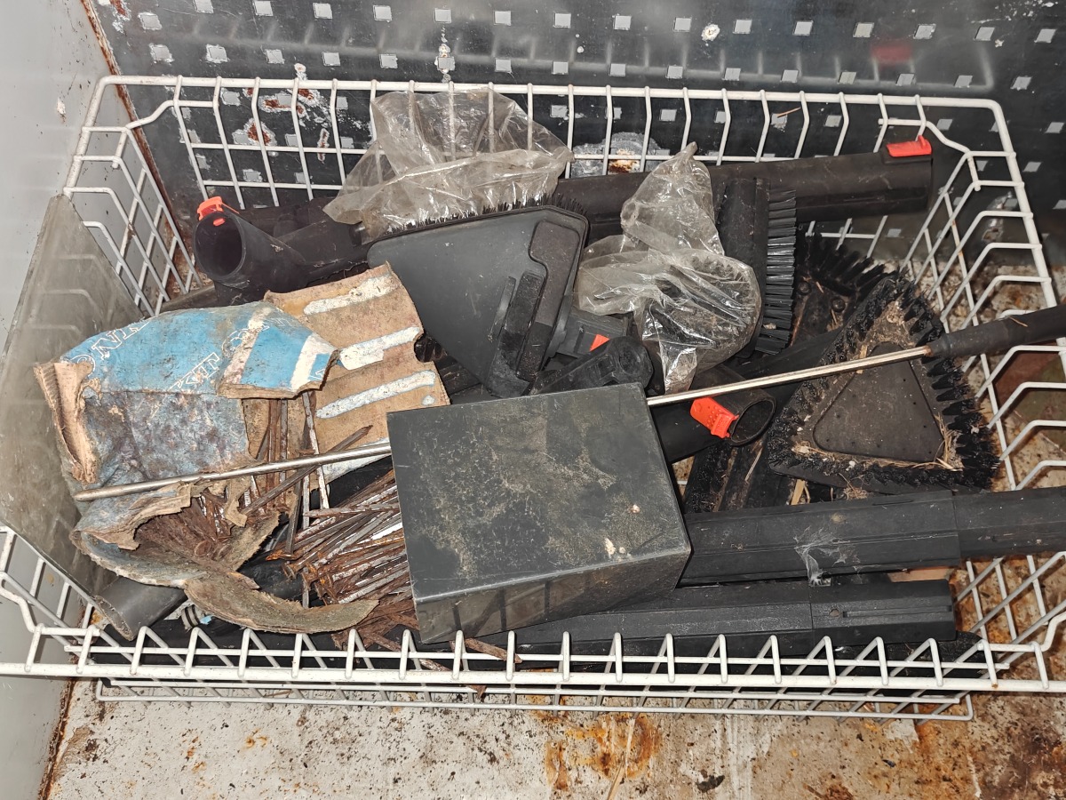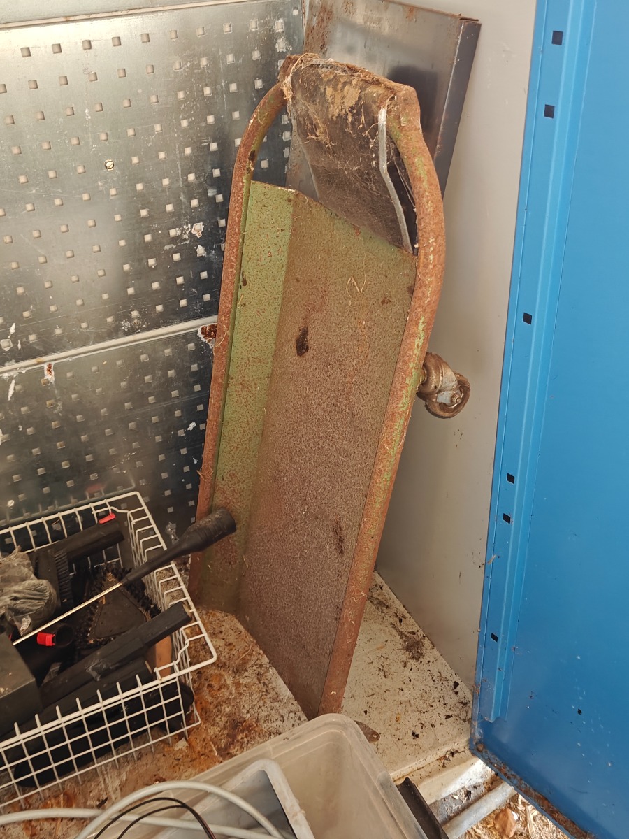 Stålskab & 4 værktøjstavler. Indhold i skab og på tavler medfølger (bl.a 2 fedtsprøjter). Selvnedtagning.