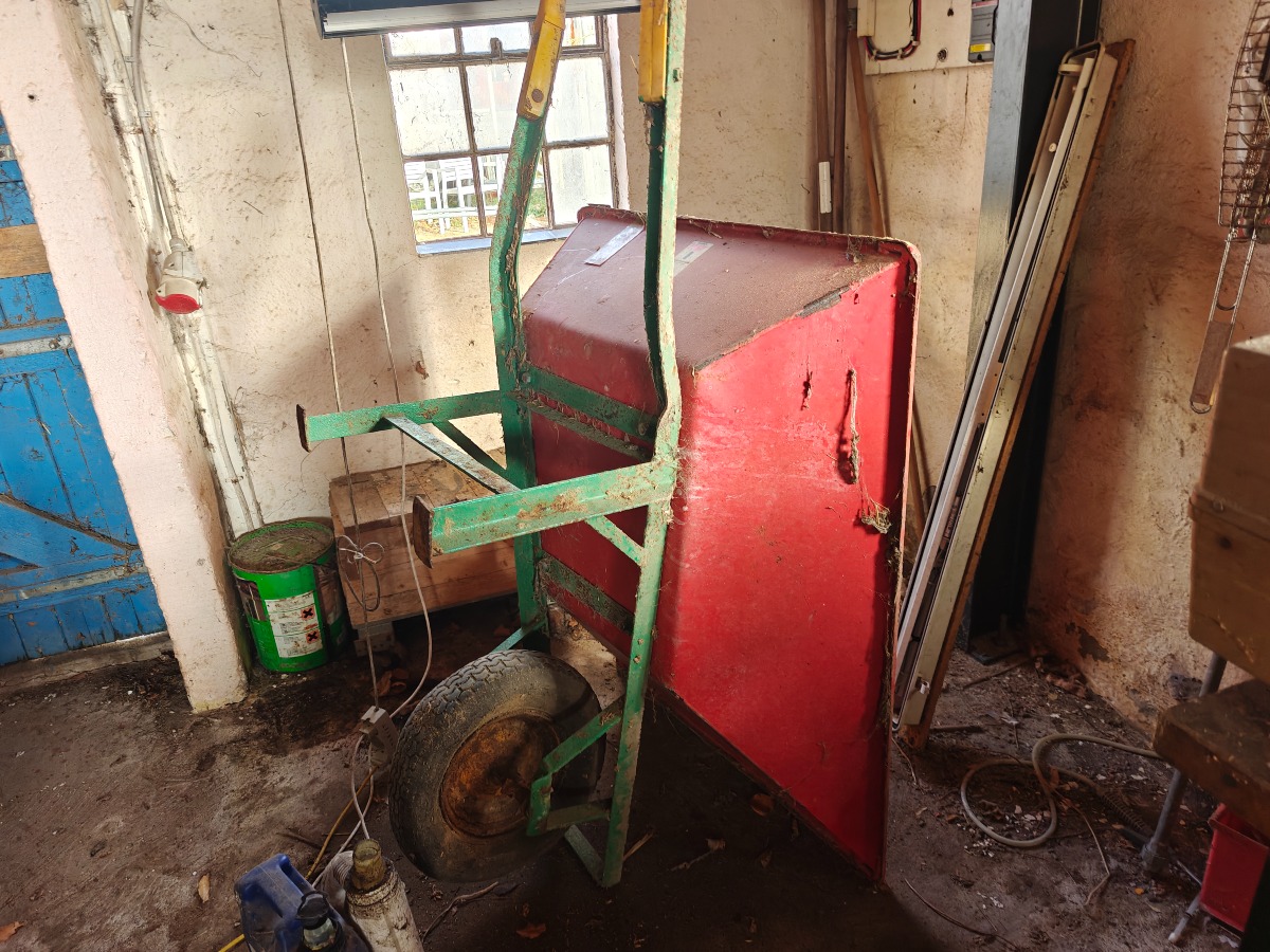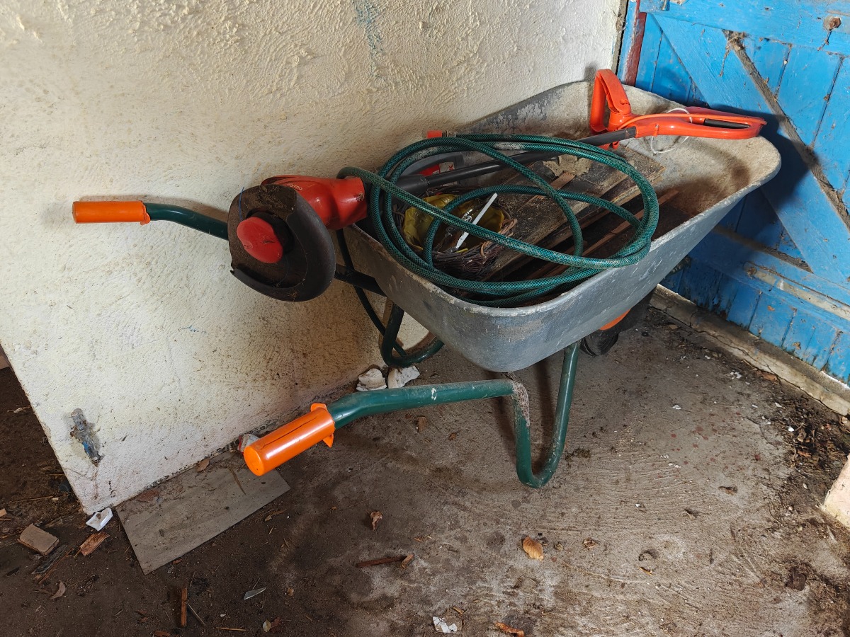 Tøm hjørnet: Trillebøre, græstrimmer, sækkevogn, haveredskaber, trækasse mm.